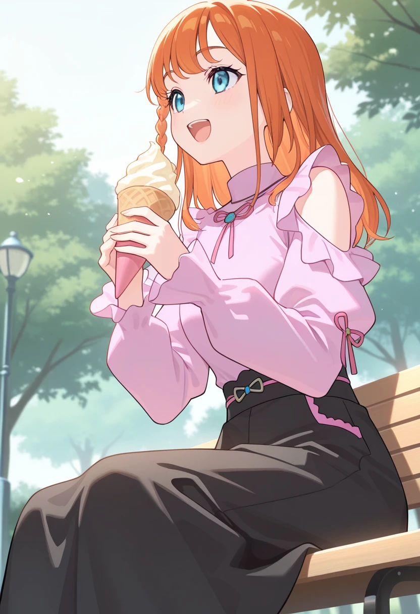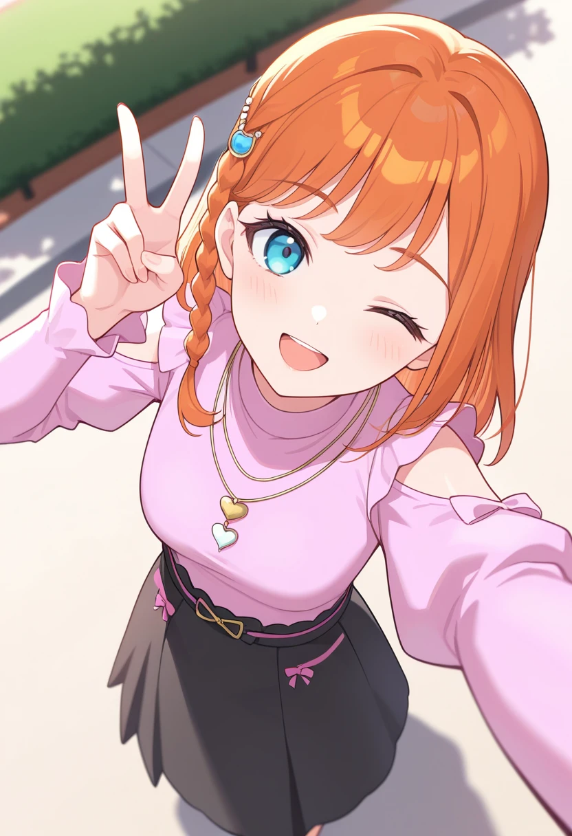 dress: matsurimodel, blue eyes, accessory, braided hair, long black skirt, pink shirt, orange hair, shoulder cutout,,