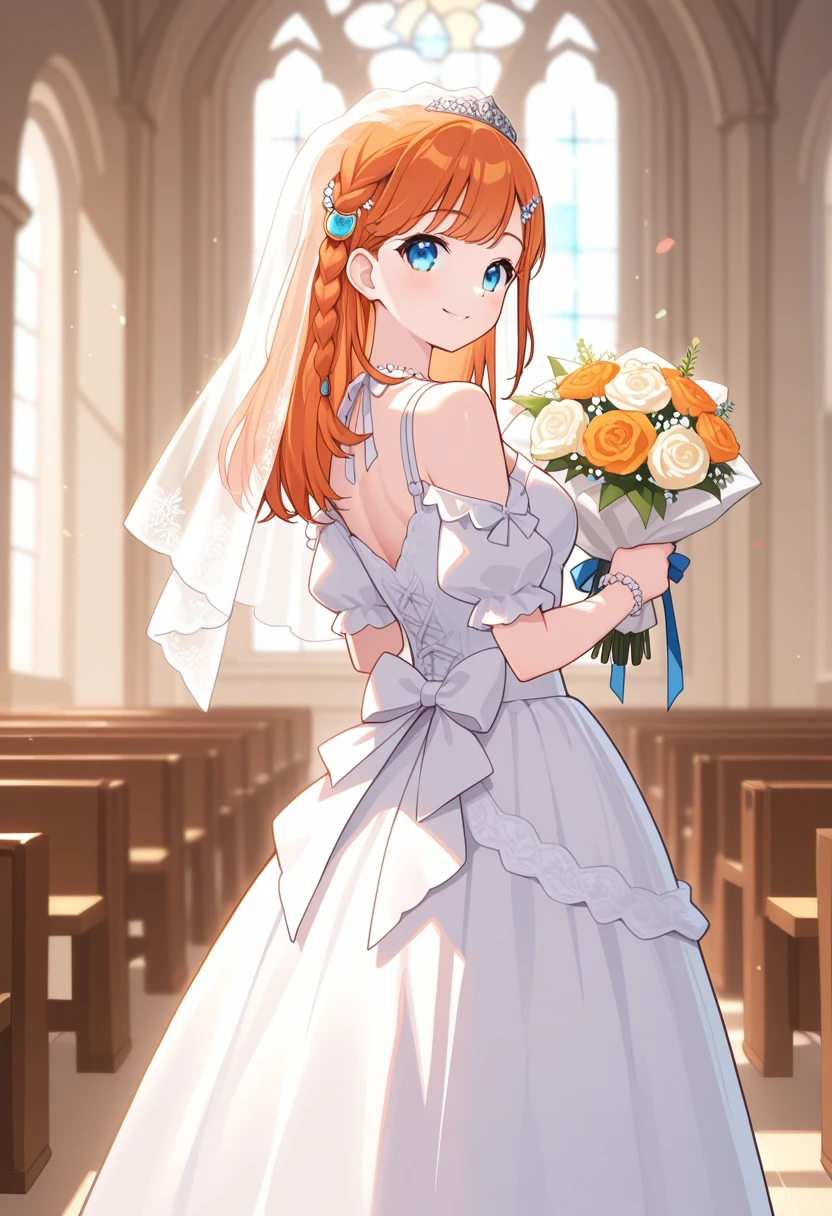 casual: matsuri, blue eyes, hair accessory, jeans, braided hair, orange hair, casual clothing, white vest, sleeves past elbows,,