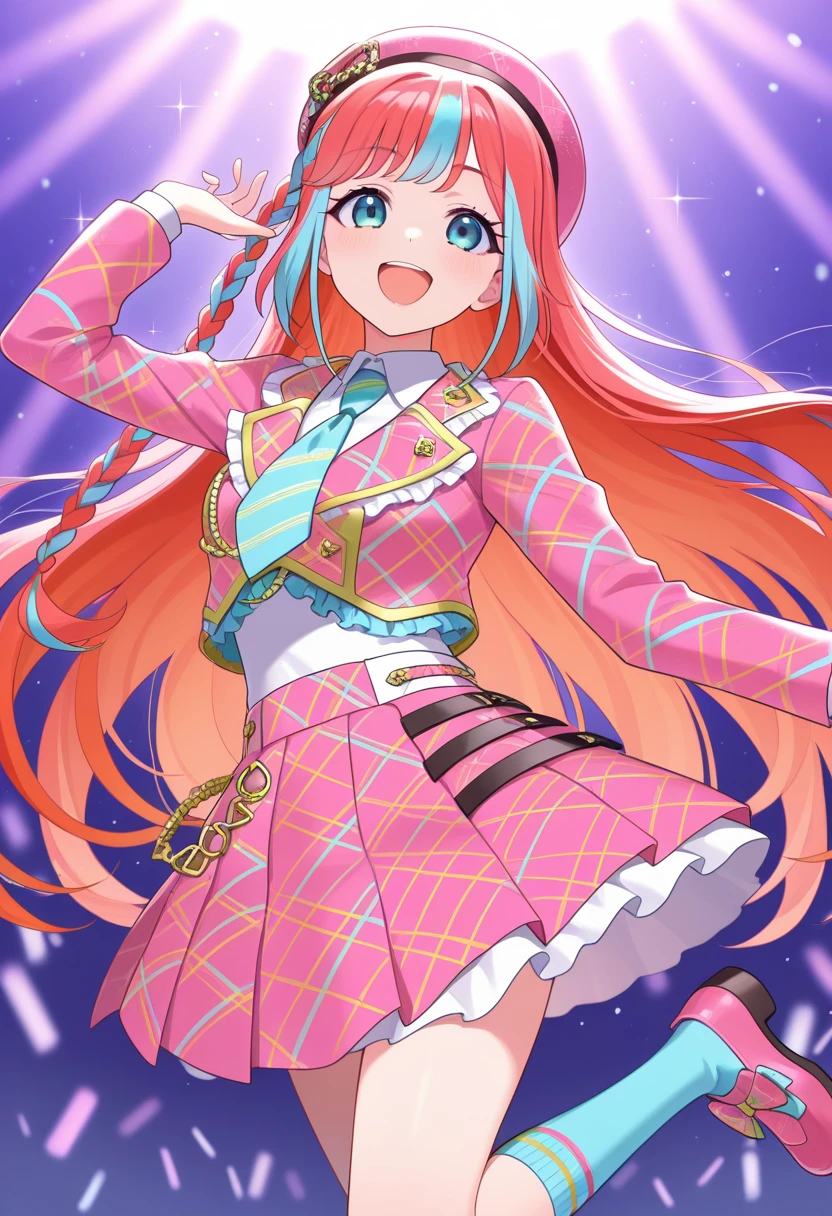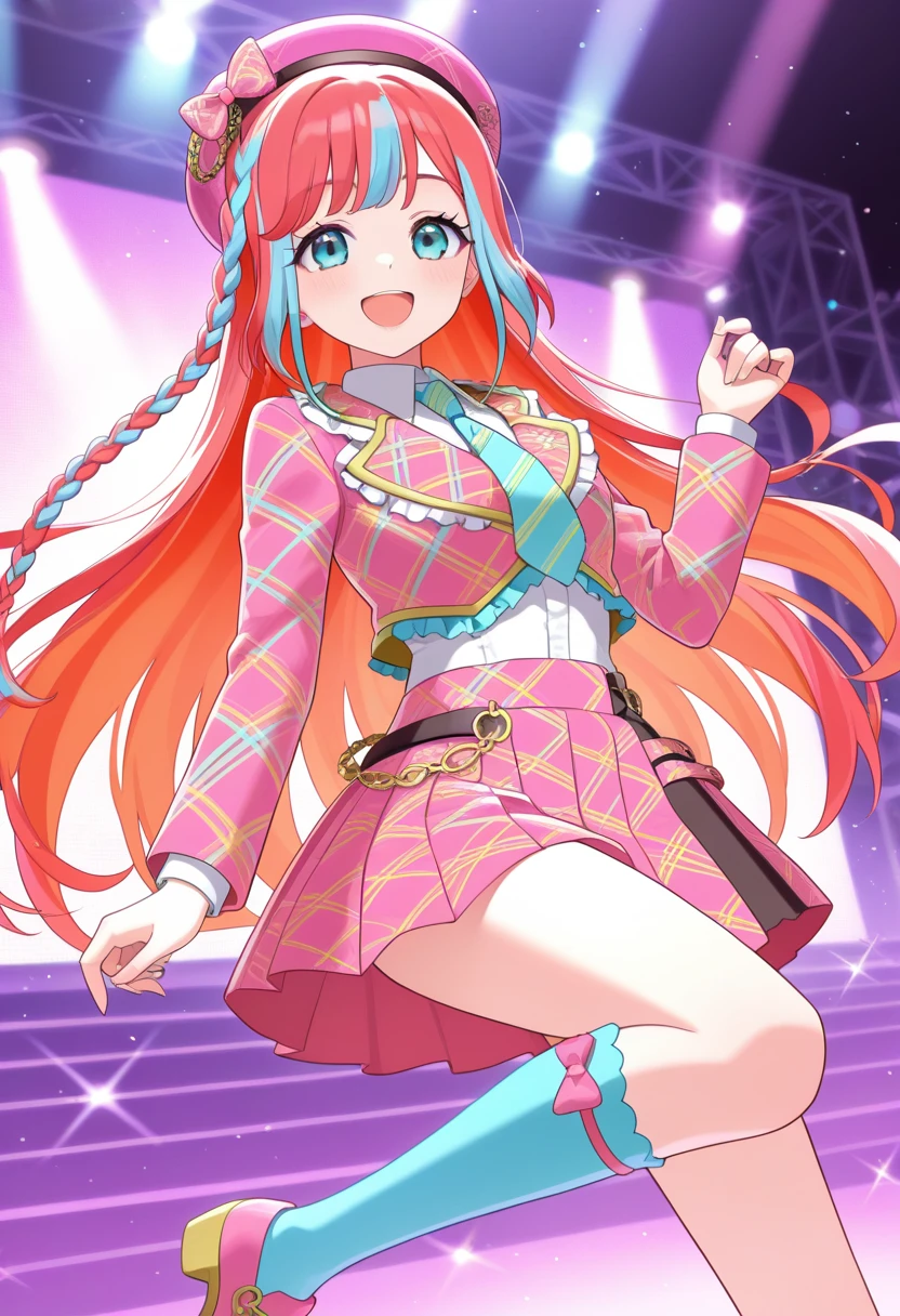 Primagista: matsurimagista, blue eyes, legwear, long hair, hat, accessory, shoes, hair accessory, socks, necktie, braided hair, idol clothes, multicolored hair, pink skirt,