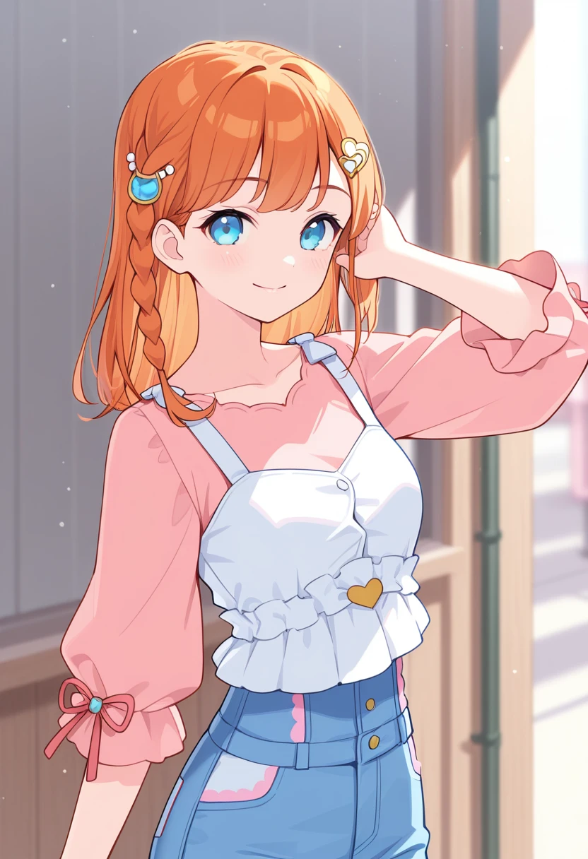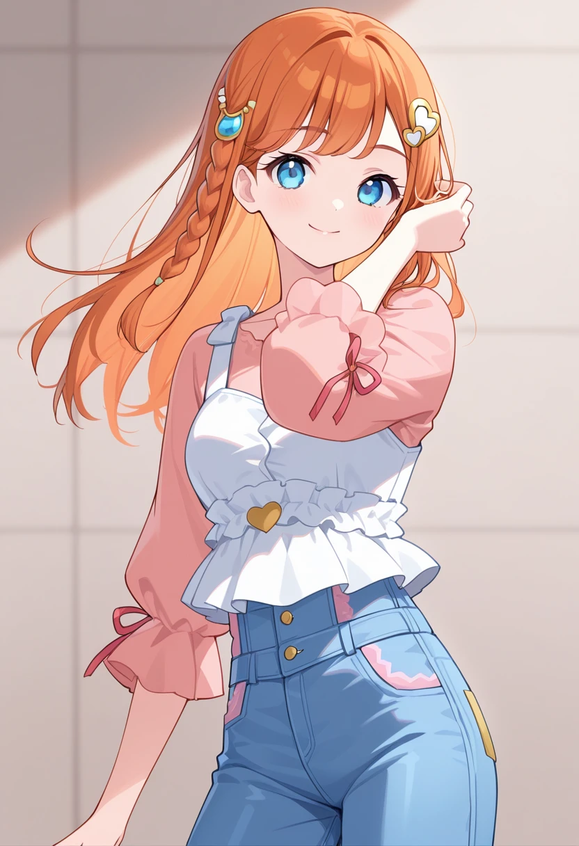Prompts: matsuri, female, solo, clothing, hair, blue eyes, hair accessory, orange hair, blue pants, braided hair,
