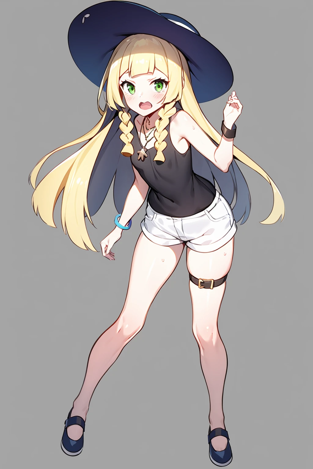 lillie \(pokemon\), 1girl,blonde hair, braid,ponytail,blunt bangs,green eyes,short sleeves, white shirt,white skirt, pleated skirt, miniskirt,
