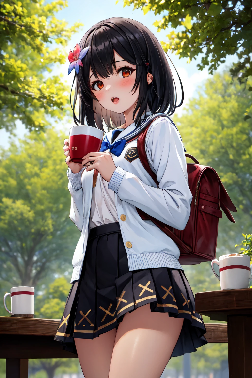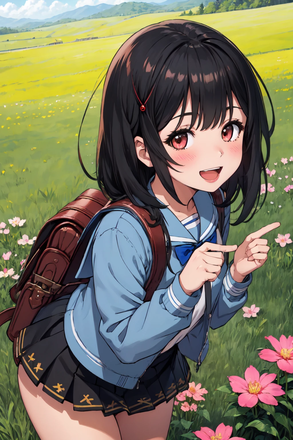 vikalahu, black hair, long sleeves, black skirt, white panties, school uniform, school bag, blue bow