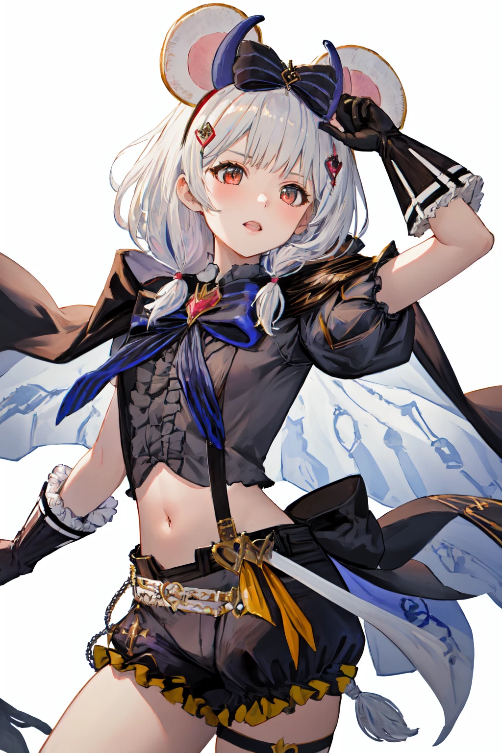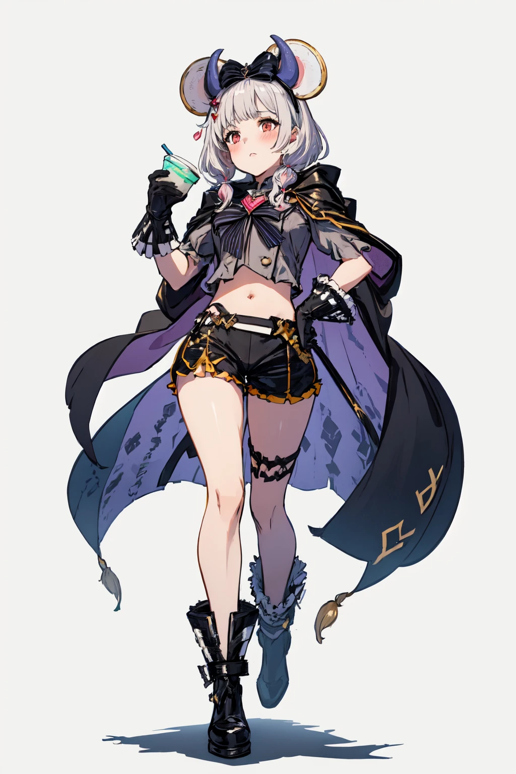 vikalahw, fake animal ears, hair bow, black gloves, grey crop top, puffy shorts, cape, midriff