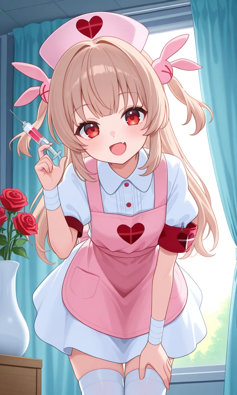 🍆Default outfit(nurse) : nat0ri sana, sana default, long hair, two side up, rabbit hair ornament, nurse cap, pink headwear, white dress, collared dress, pink apron, puffy short sleeves, red armband, bandaged wrist, white thighhighs, pink footwear, sandals