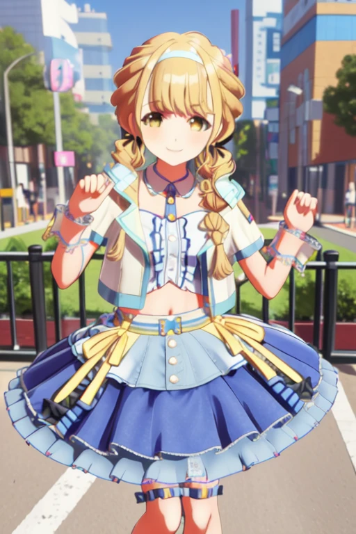 multicolored clothes, yellow shirt, open clothes, blue skirt, plaid skirt,