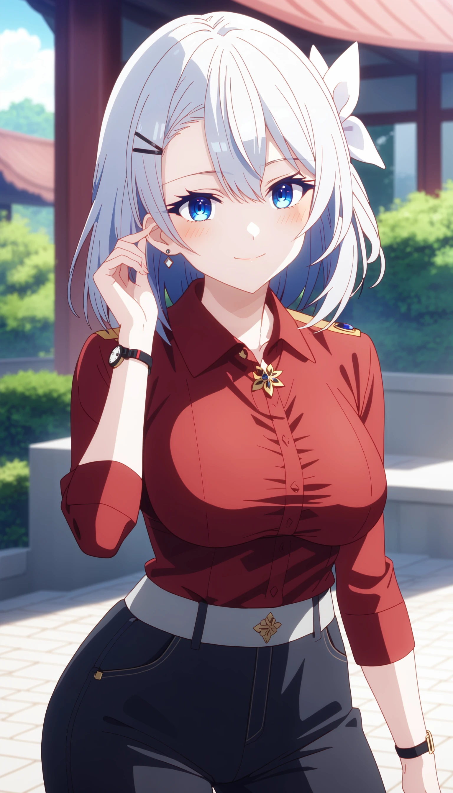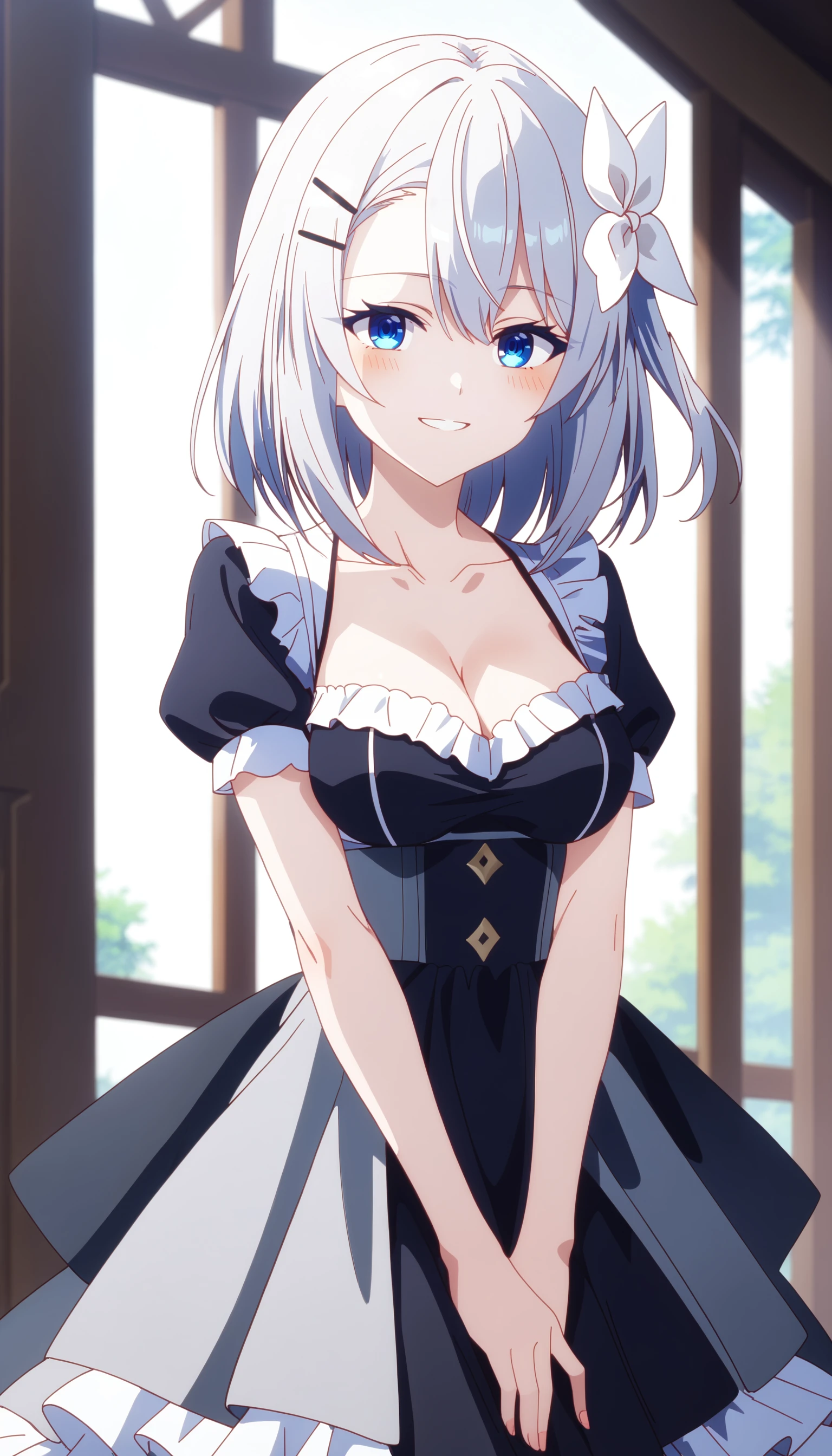 SakunaMemoir, grey hair, bangs, hair between eyes, medium hair, blue eyes, hair ornament, hairclip, hair bow