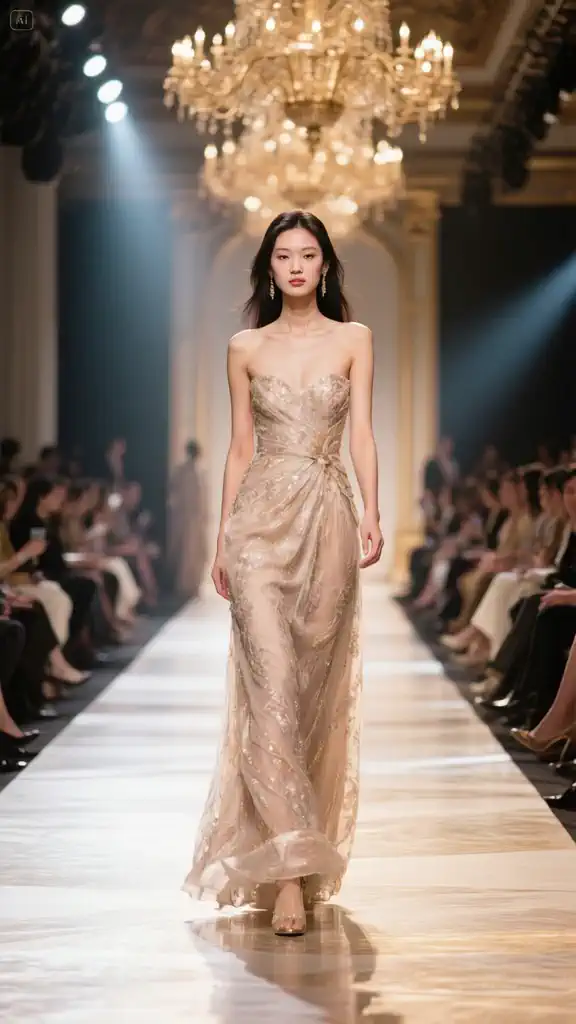1,在街道上,一位穿着白色T恤牛仔短裙的女人,在向前行走的同时服装变成淡粉色汉服,gfbz效果。