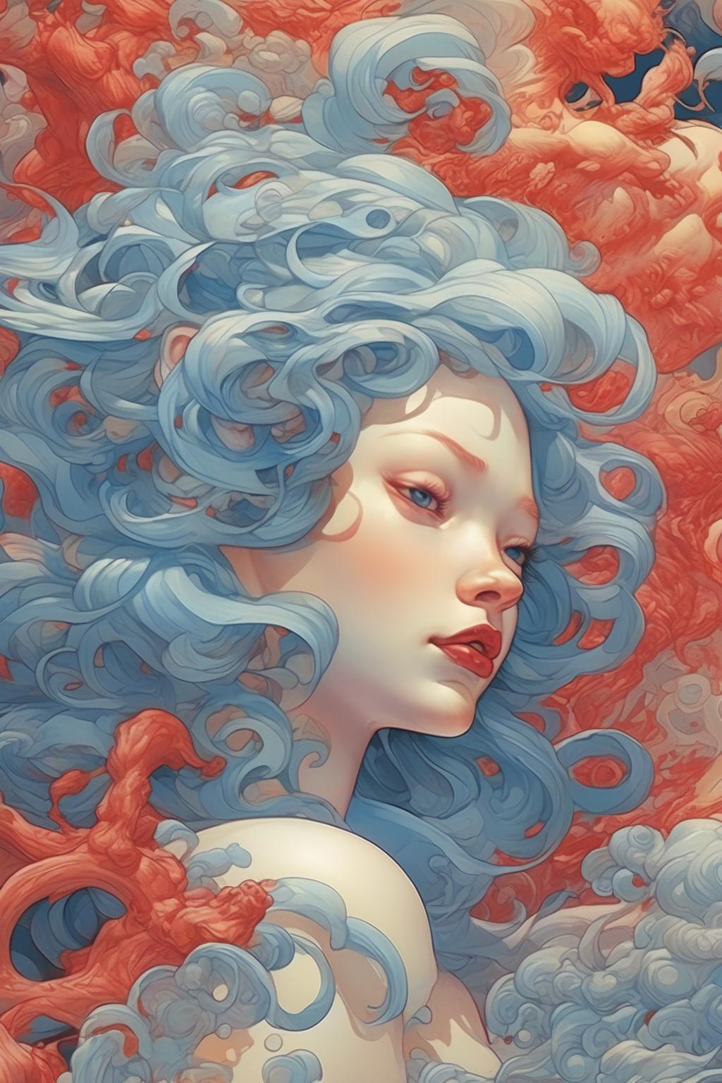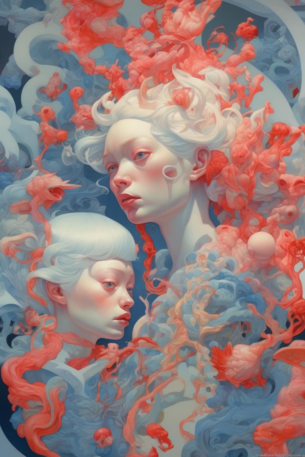 His style can be described as ethereal, fantastical, and highly imaginative. Jean's artwork often features a blend of organic and surreal elements, combining human figures, animals, and intricate patterns into visually captivating compositions.