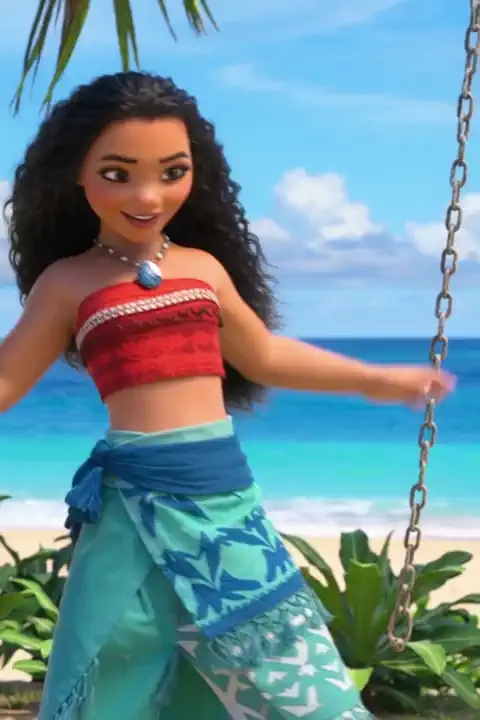 3d animation, Disney Style, a beautiful young woman with long hair, Moana from Disney's Moana. She is outside standing on a beach in a tropical Polynesian island.WAN2.2 version