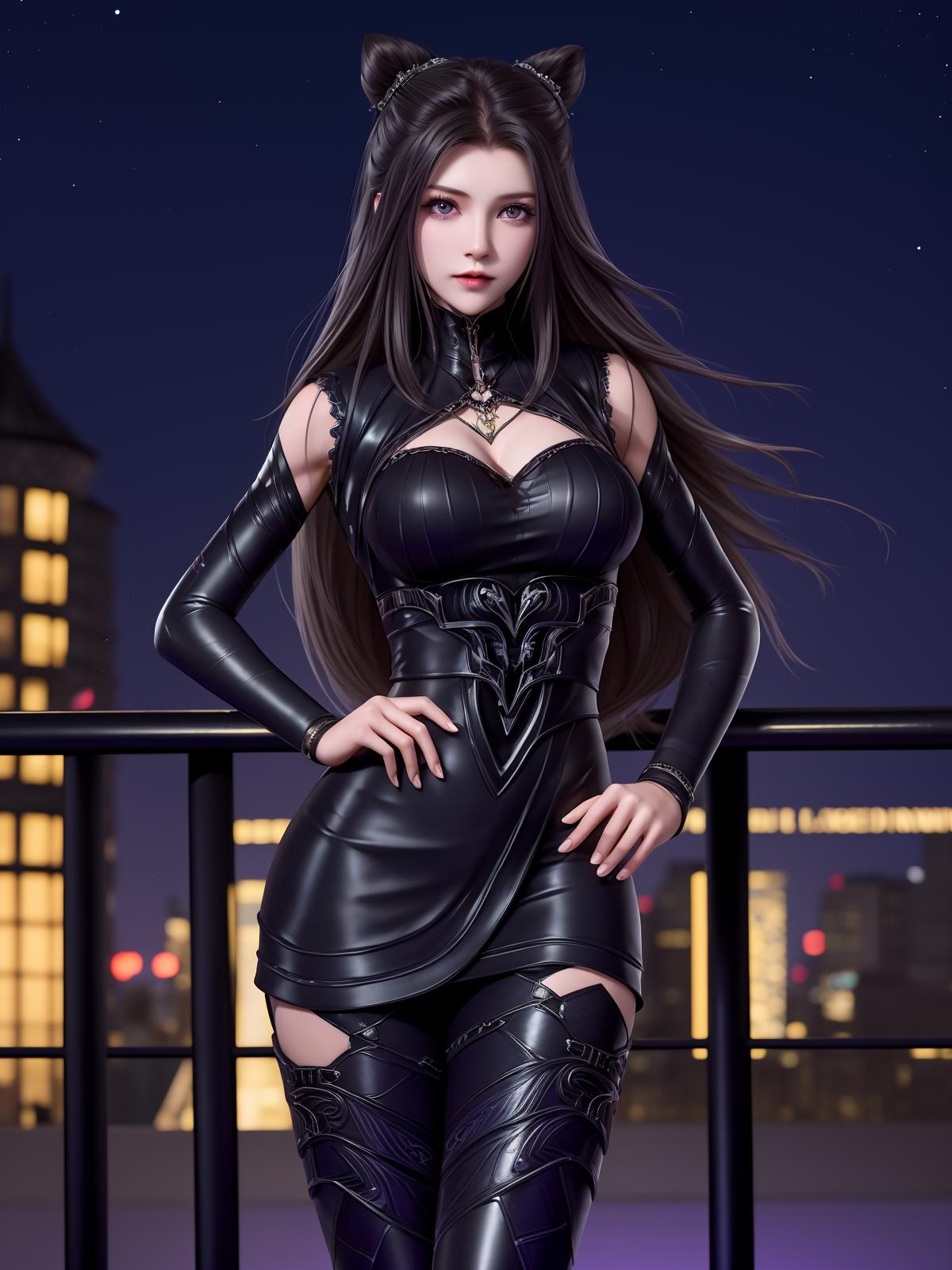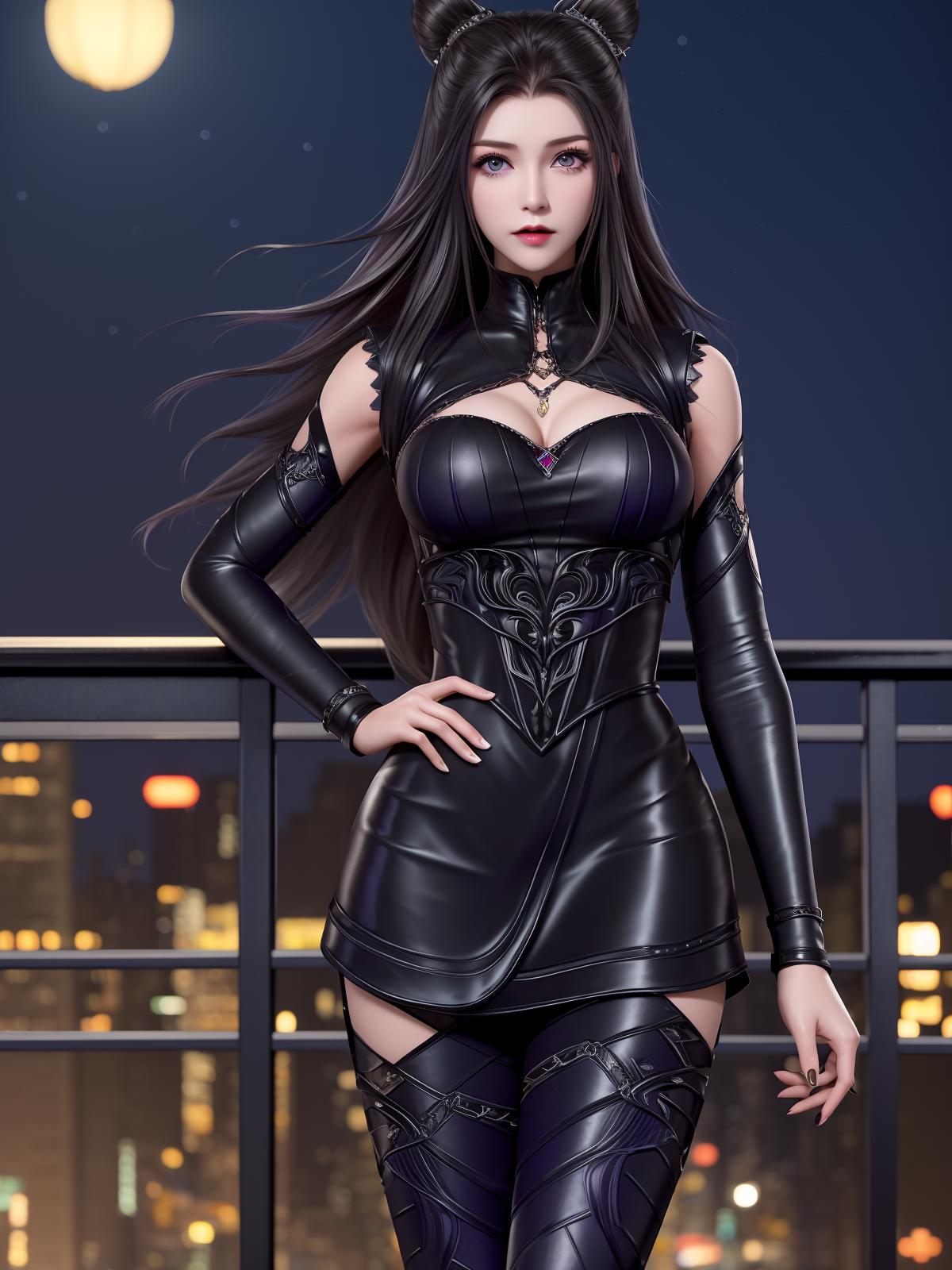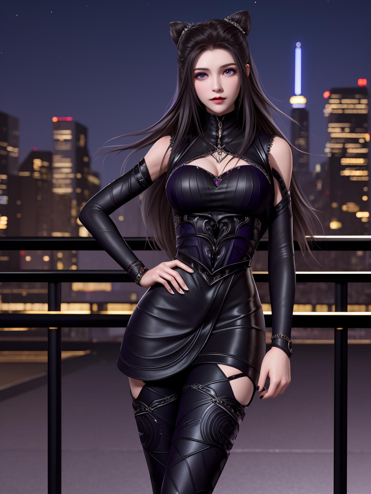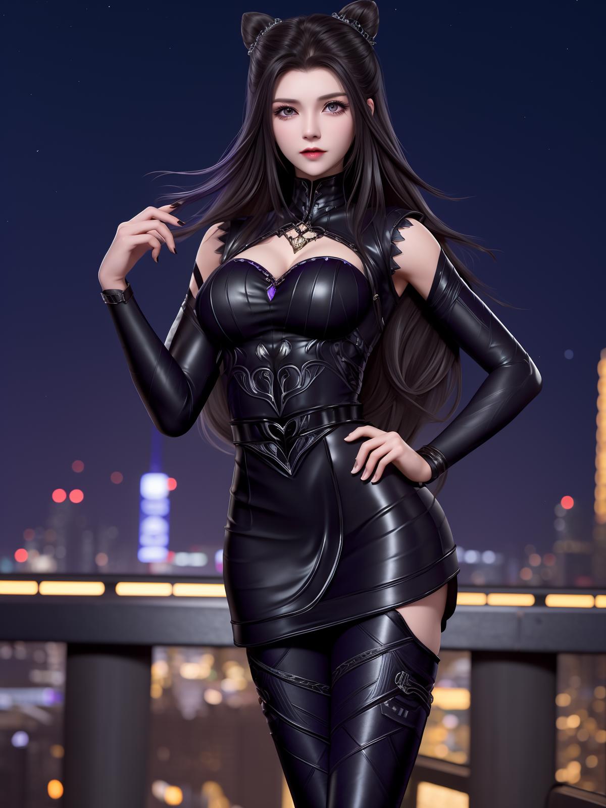 DLDLzhuzhuqing, 1girl, solo, black hair, long hair, purple eyes, thigh boots, black dress, looking at viewer, detached sleeves, jewelry, cone hair bun,mature female, cityscape, night,cowboy shot, hand on hip,