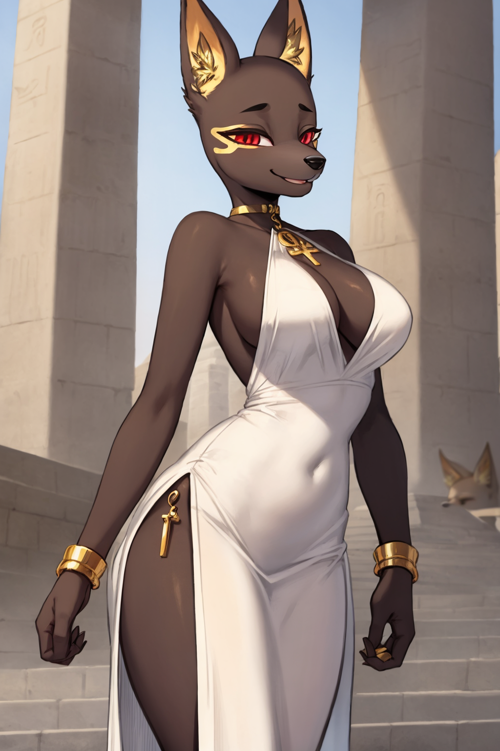 Other prompts : 1girl, red eyes, furry, animal ears, furry female, dark body fur, thighlet, ?????????????, navel, jewelry, thick thighs, ankh