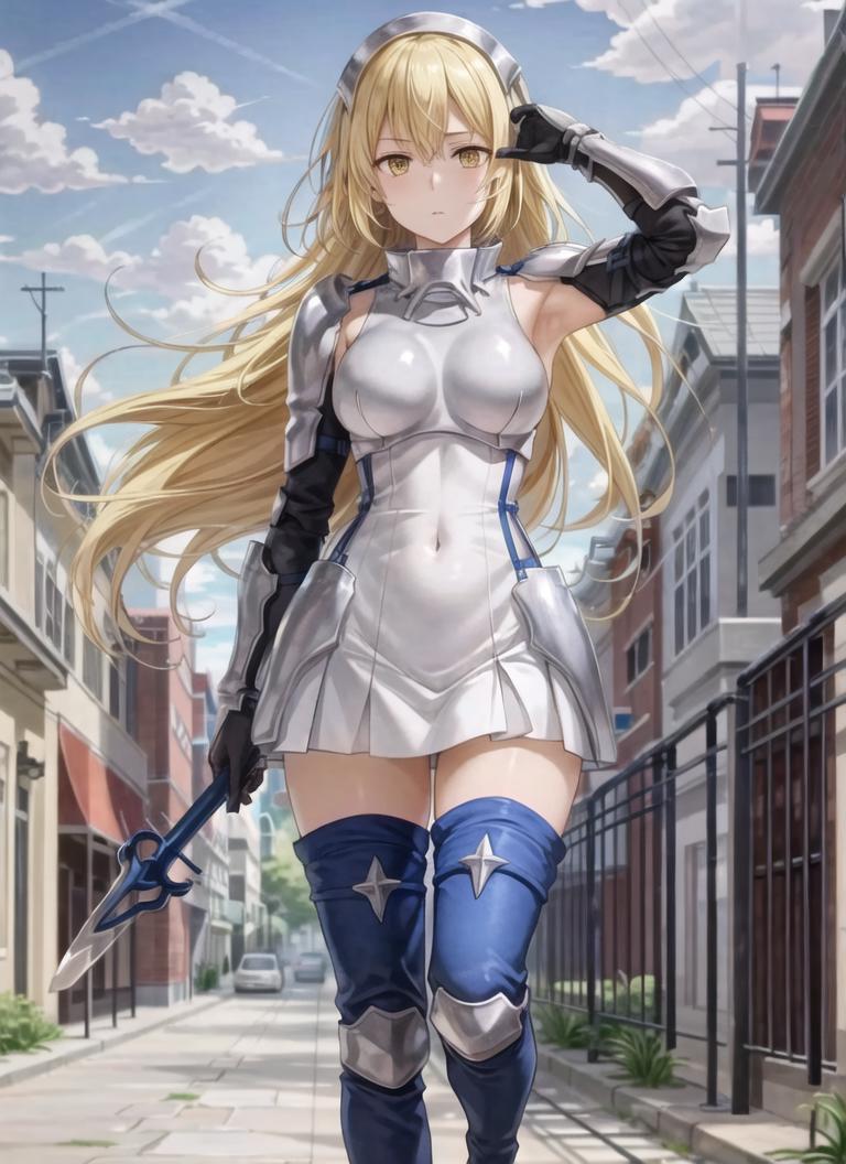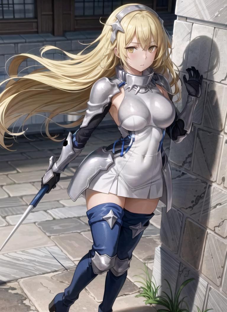Recommended Prompts: ais, 1girl, solo, blonde hair, armor, long hair, straight hair, thighhighs, boots, dress, yellow eyes, thigh boots, blue long boots, blue footwear, covered navel, breastplate, shoulder armor, gloves, white dress