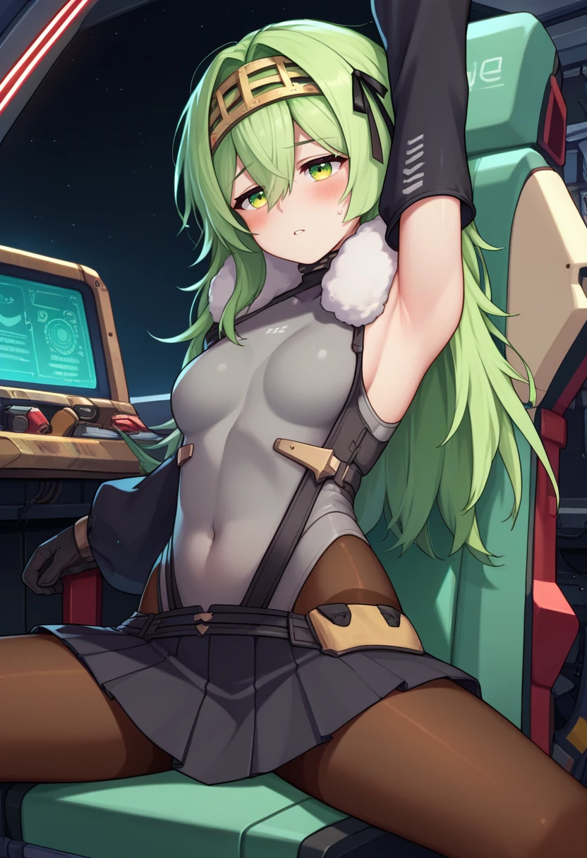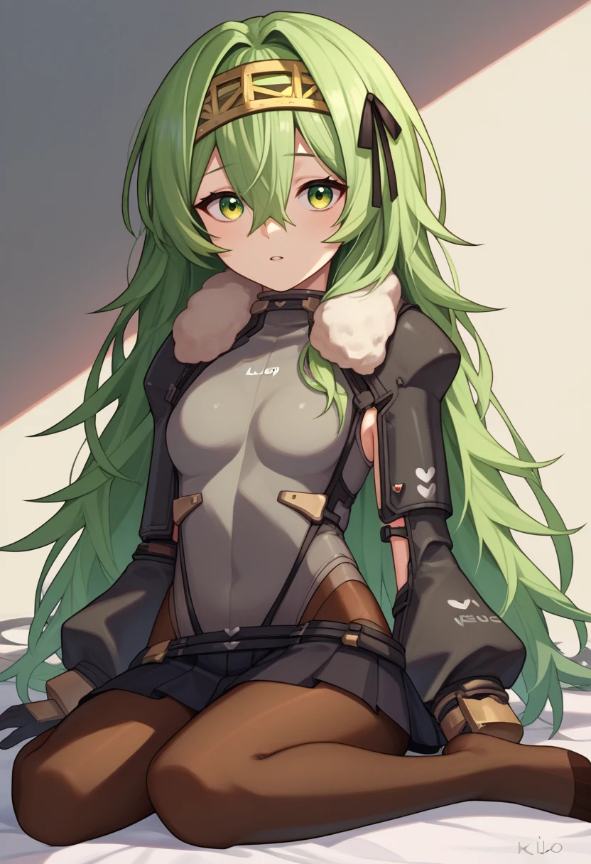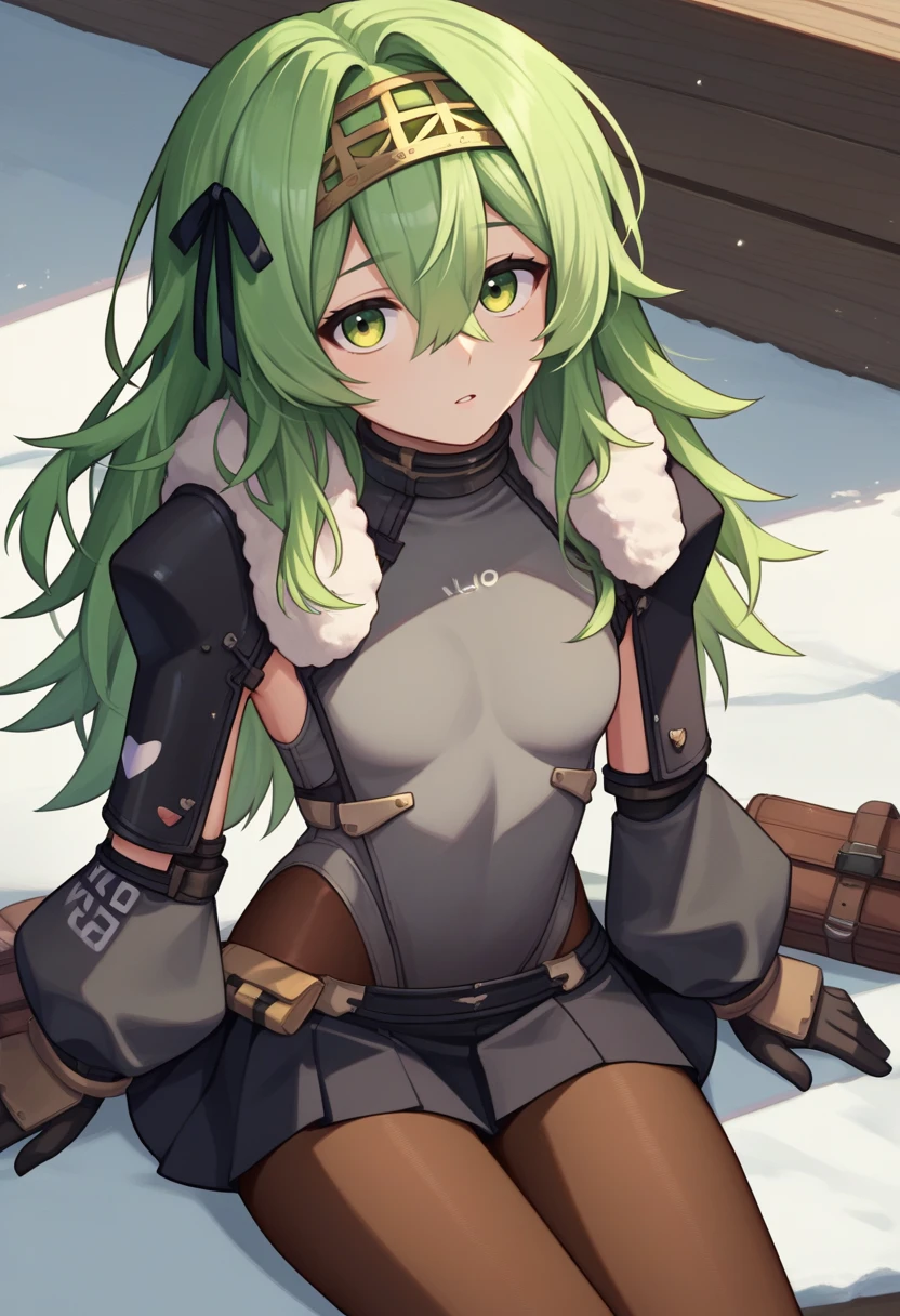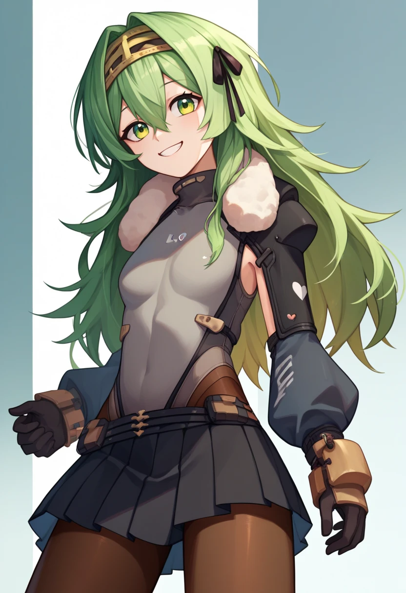 kilo, green eyes, green hair, long hair, hairband, black hair ribbon, fur trim, grey leotard, black sleeves, long sleeves, black skirt, pantyhose, gloves
