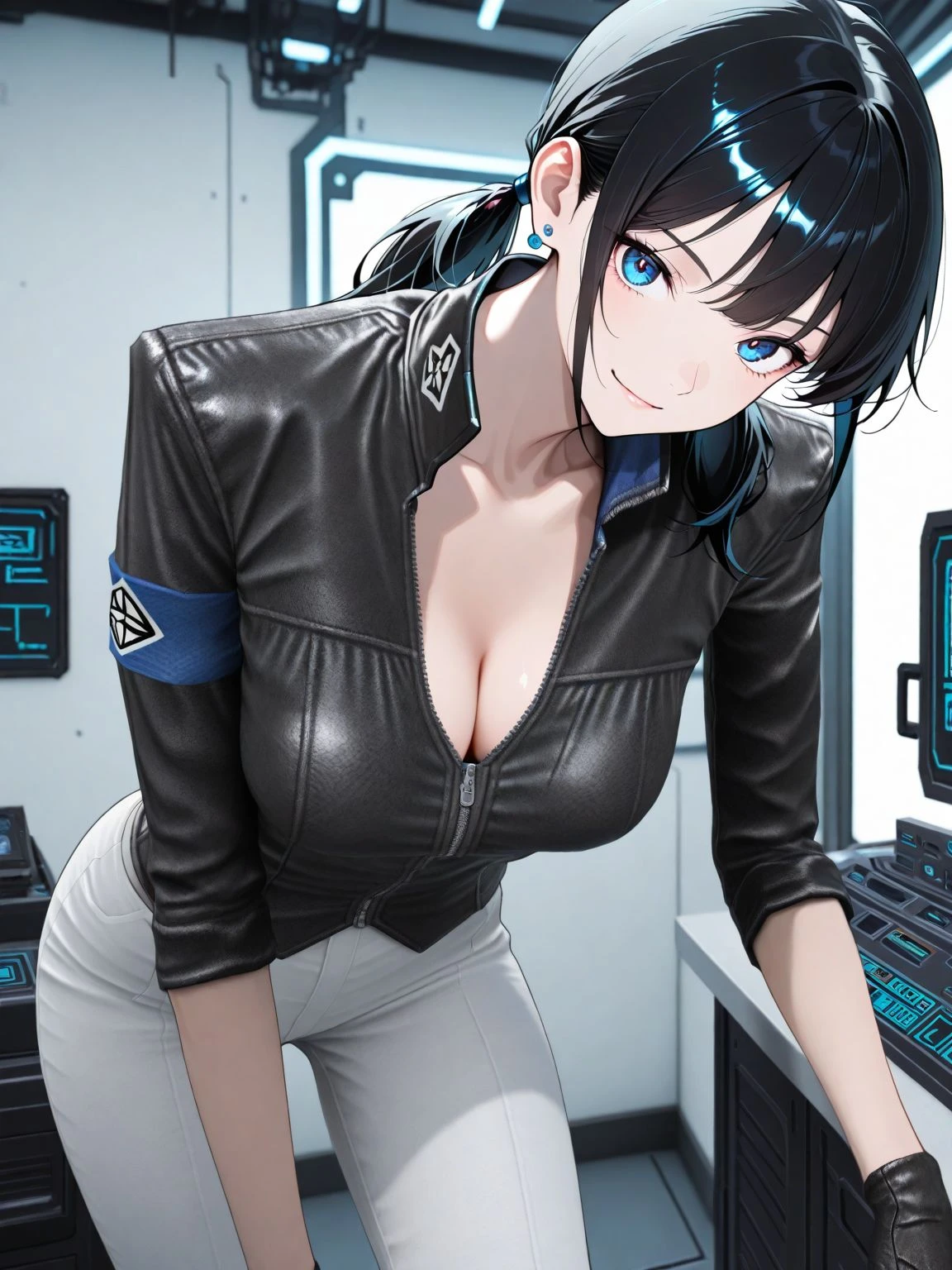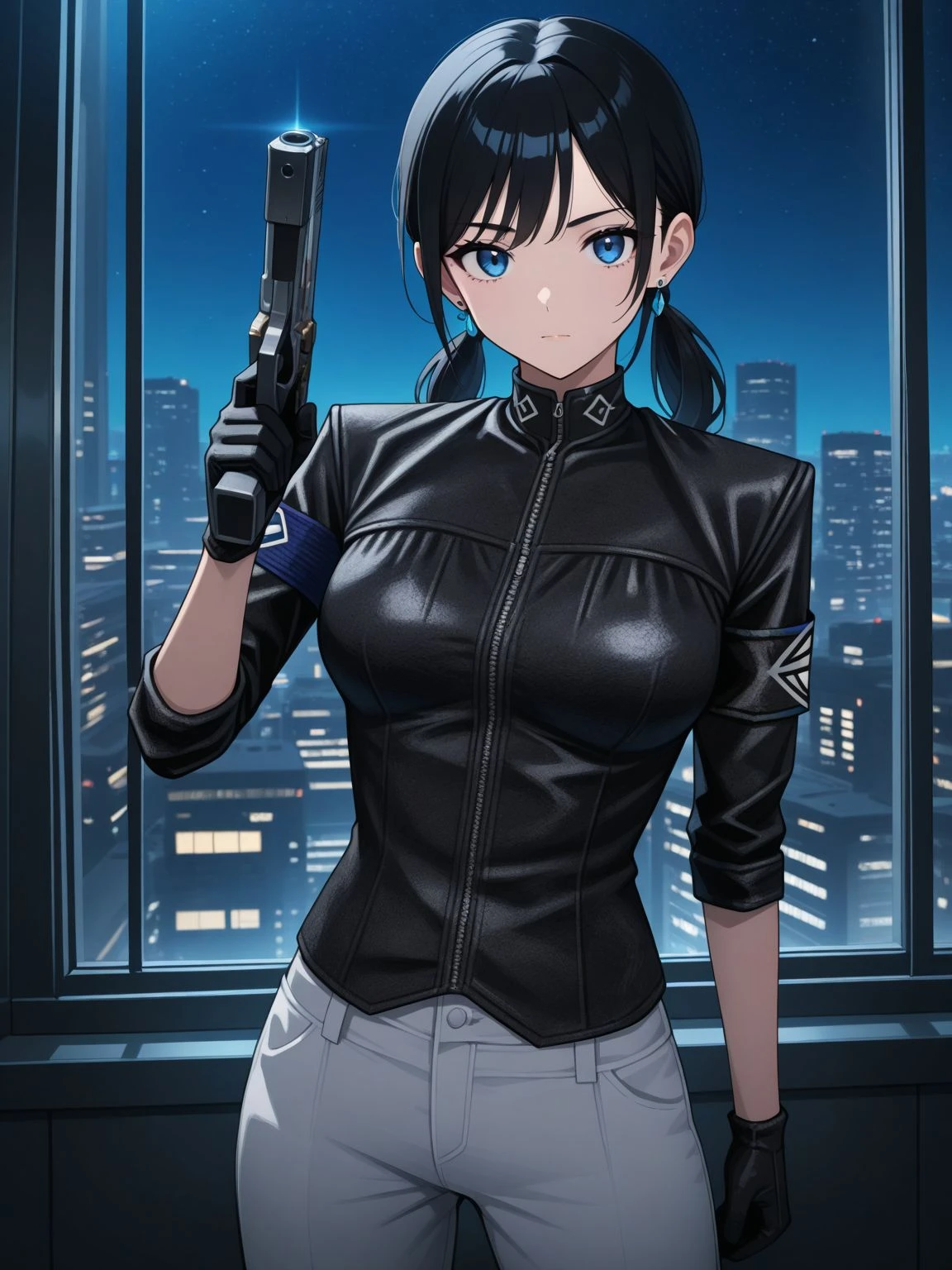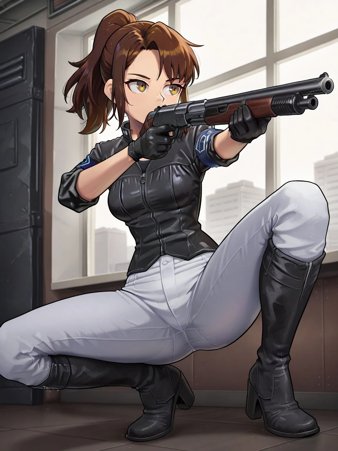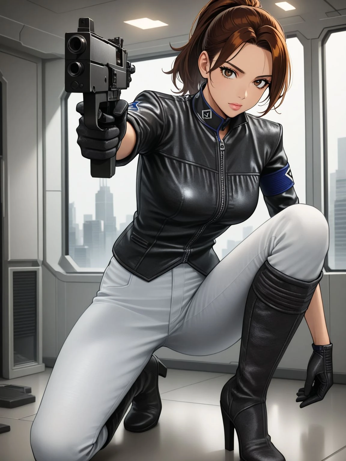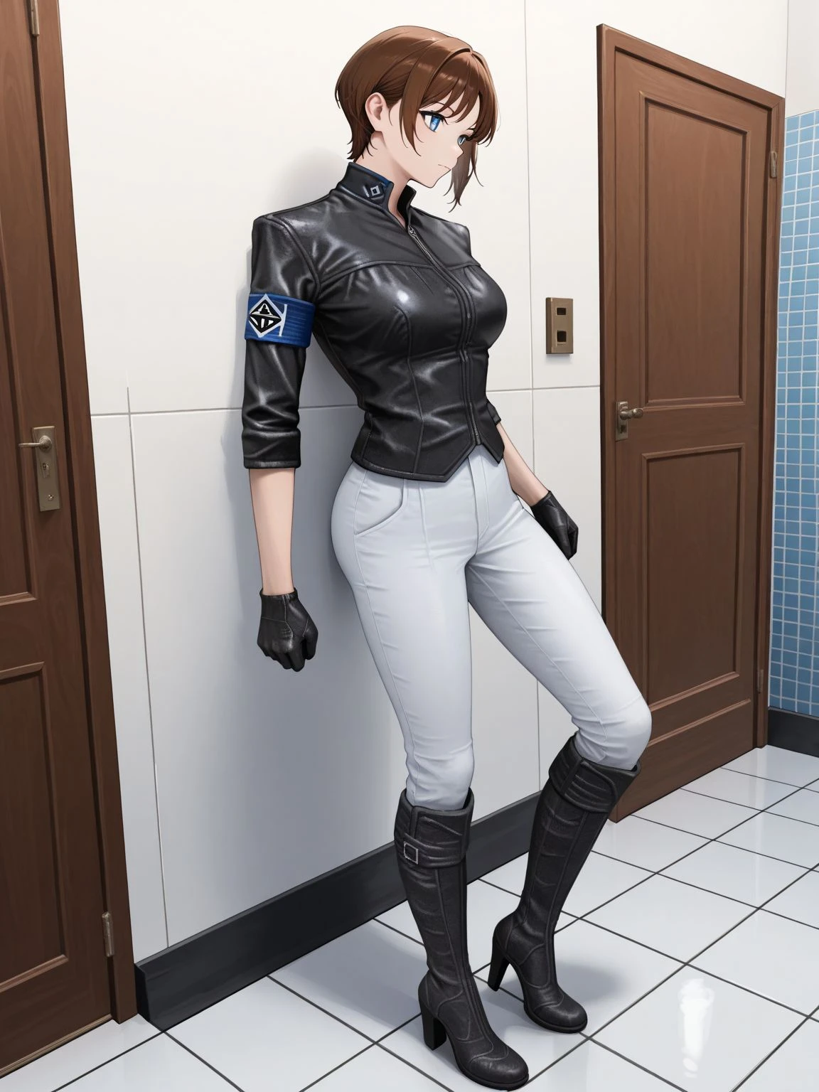 sleeves rolled up,black jacket,leather,leather jacket,zipper,armband,gloves,black gloves,pants,white pants,boots,knee boots,high heels,high heel boots,black footwear,pants tucked in