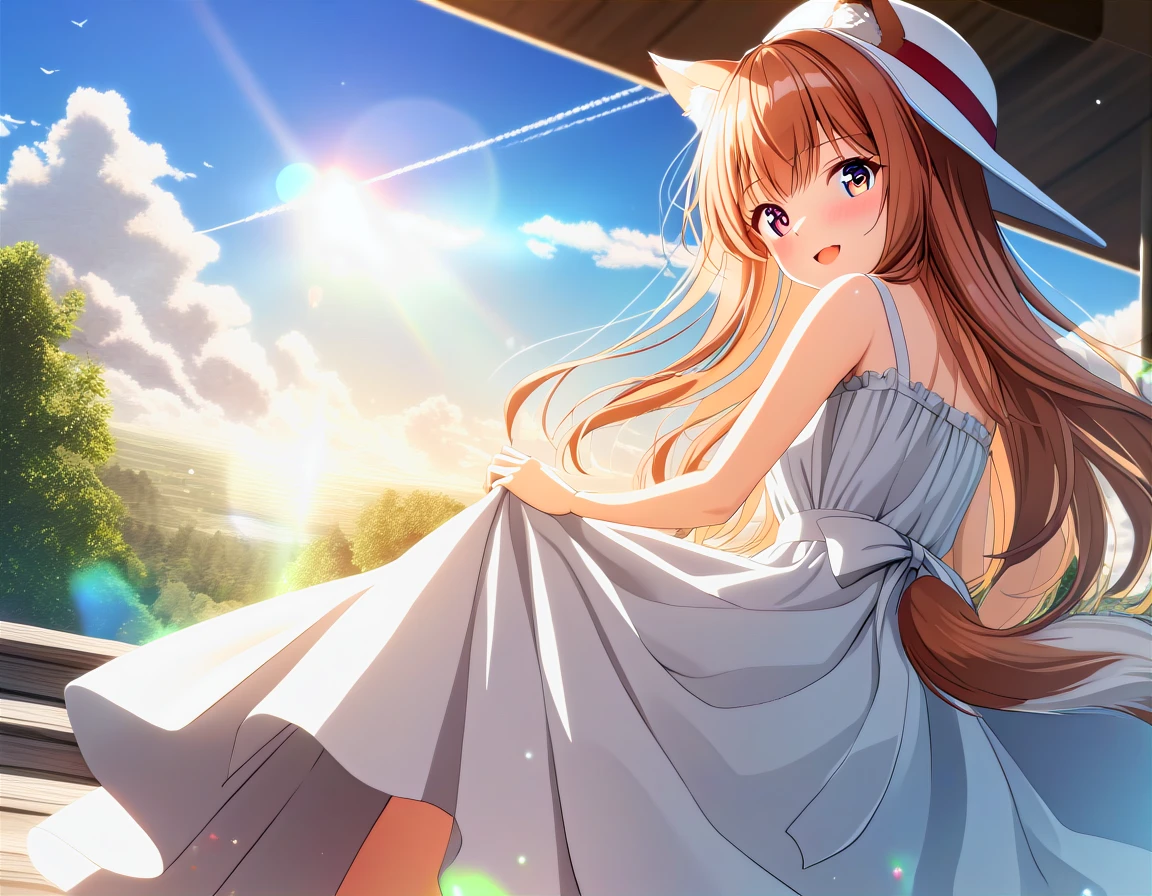 holo, long hair, animal ears, wolf girl, wolf ears, red eyes, wolf tail, brown hair