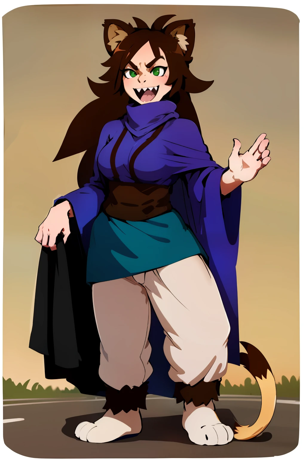 brown hair, long hair,medium ??????, sport pants, long pullover, lion tails, living hair, animal fangs,green eyes, kemono mimi, cloak, medieval cloak flip flops