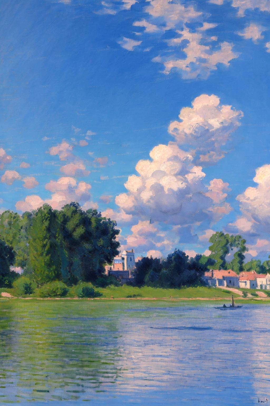 Additional tags: Monet, oil painting, Boat, Sunset, Architecture