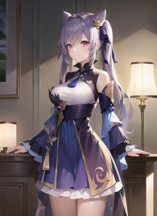 The main trigger word is keqing. It has a weak association with her uniform, which means it can easily be replaced by something else (like in the examples).