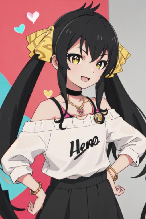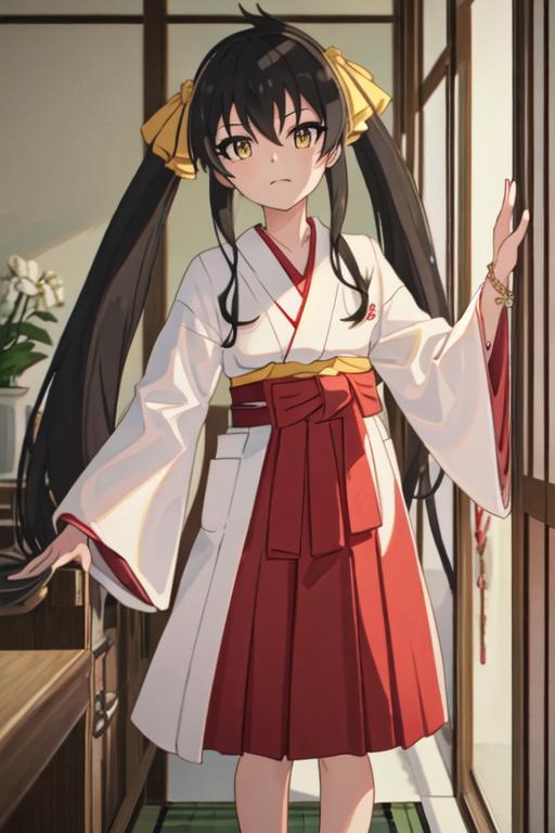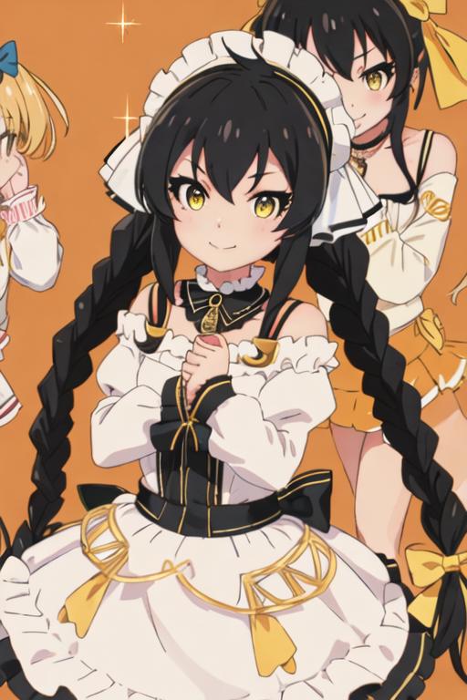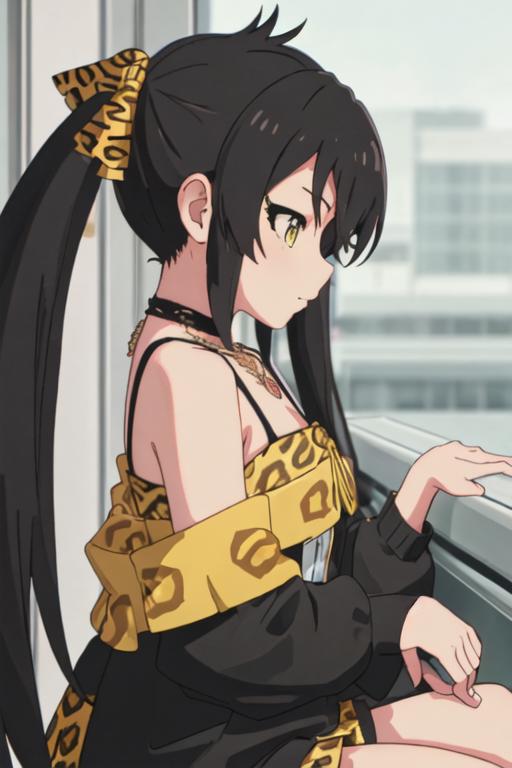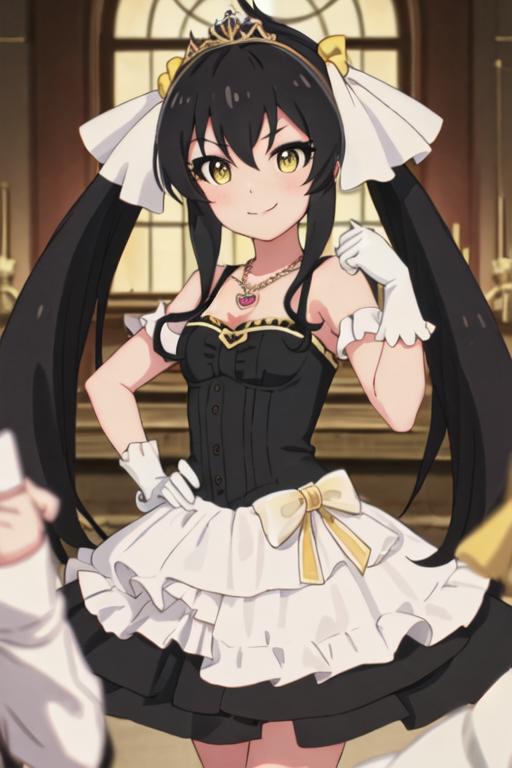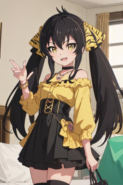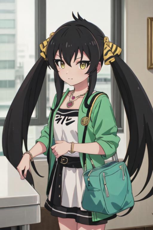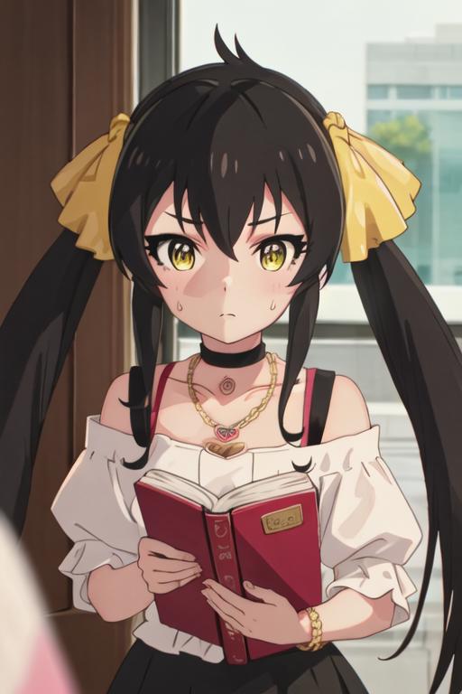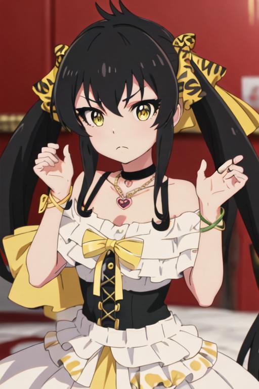black_hair, long_hair, twintails, yellow_eyes, ribbon, hair_ribbon, jewelry, necklace, hair_between_eyes
