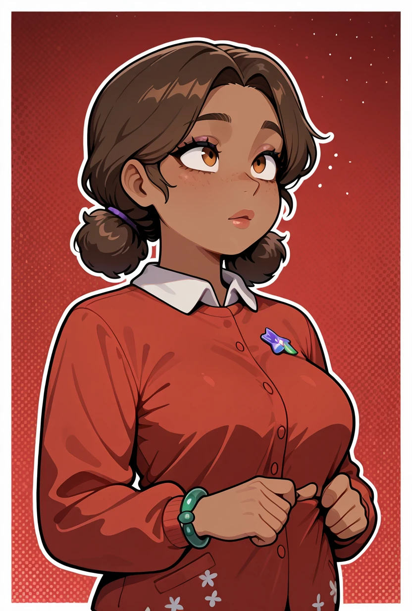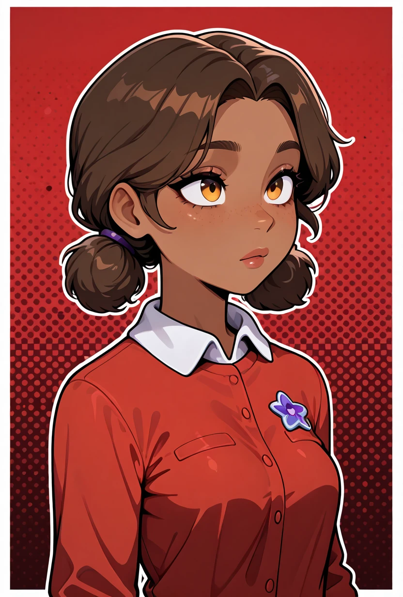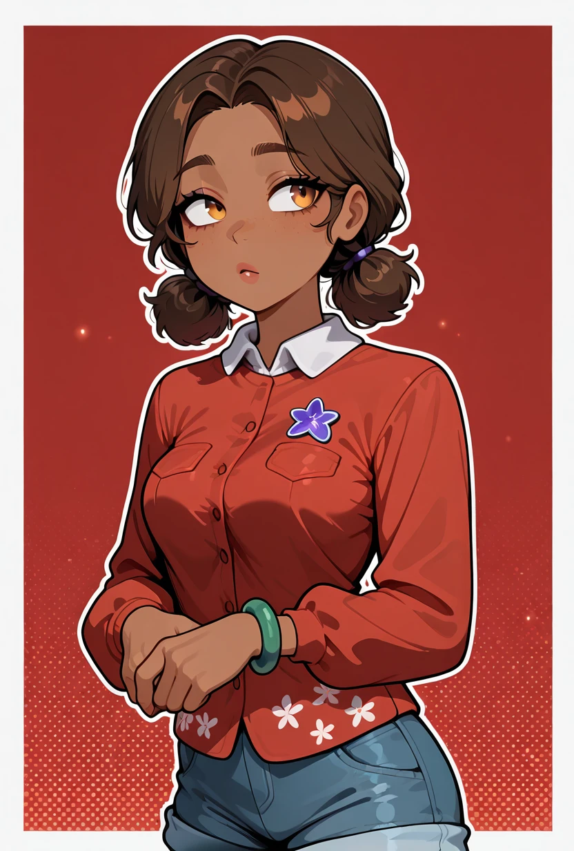 cassiefnaf, brown hair, 1girl, dark skin, long sleeves, red shirt, collared shirt, blue denim shorts, pantyhose under shorts, short twintails, green bracelet