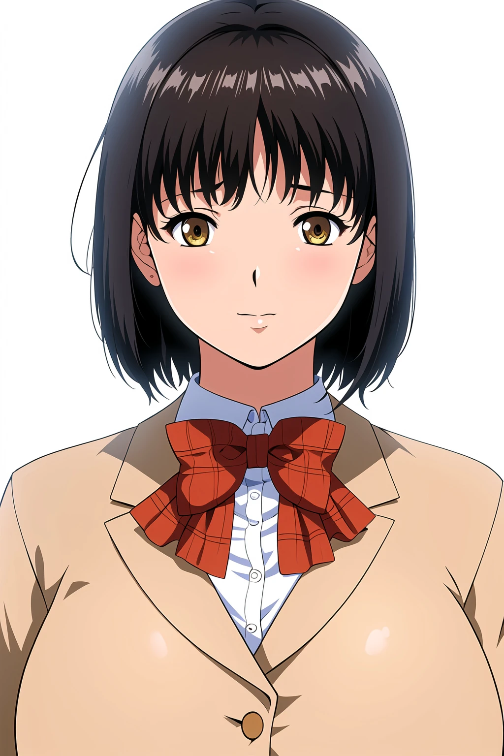 school uniform,brown jacket ,long sleeves,white shirt, red bowtie, plaid skirt,