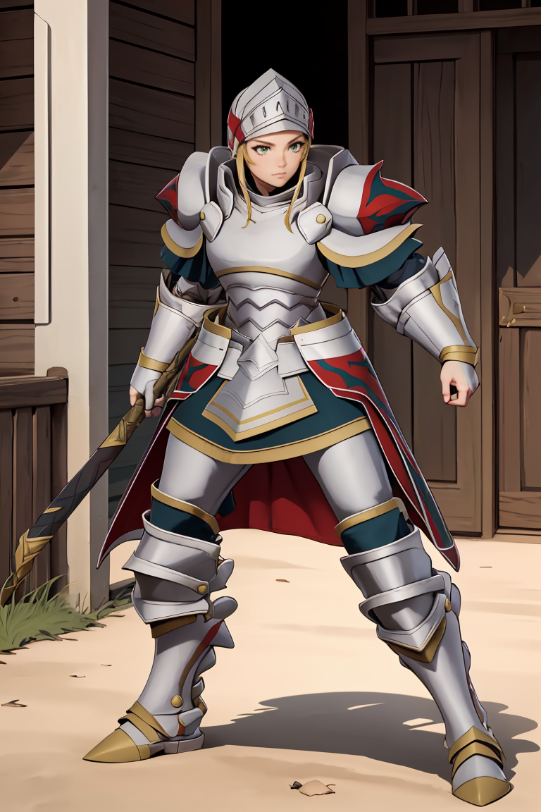 【default outfit Prompt】: def_jade, armor, breastplate, gauntlets, shoulder armor, pauldrons, boots, faulds, plate armor, greaves