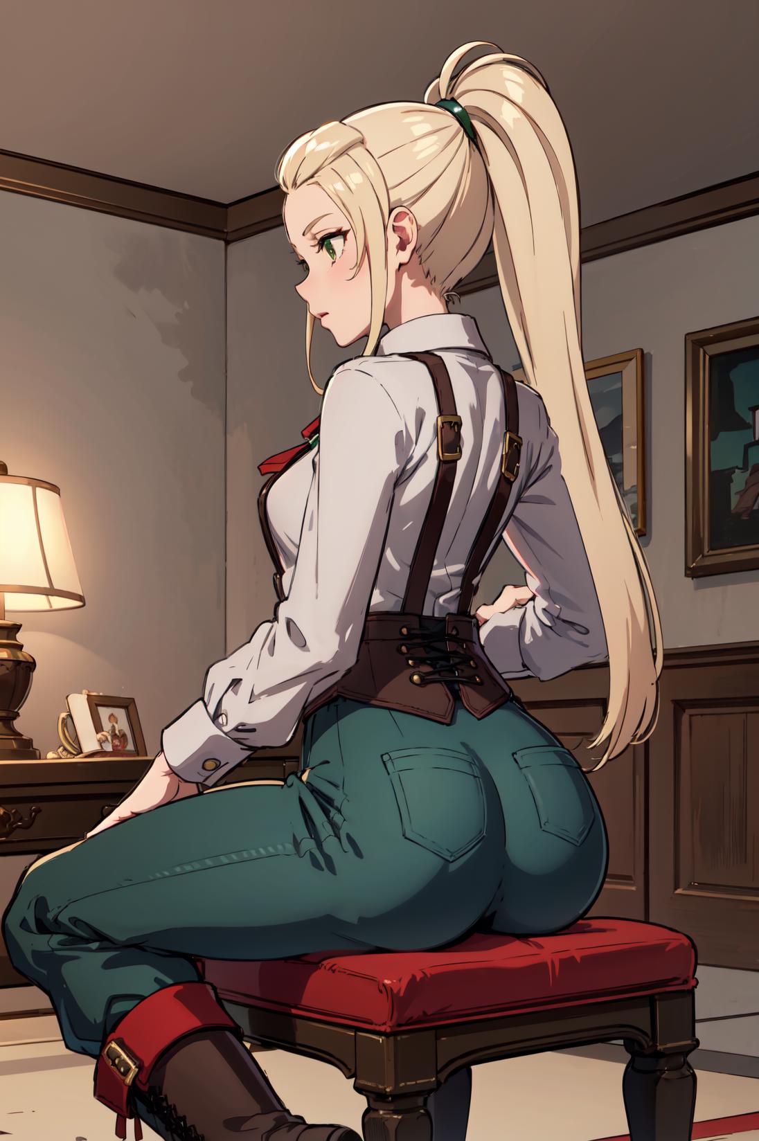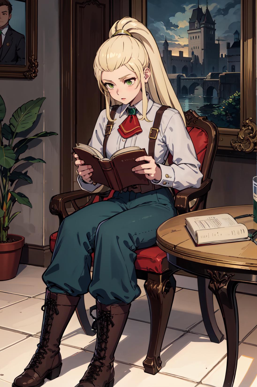 【other(private) outfit Prompt】: oth_jade, boots, shirt, long sleeves, suspenders, ascot, collared shirt, green pants, brooch