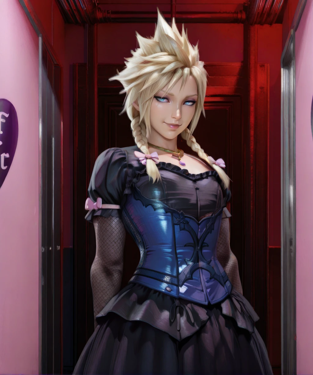 Alternate - black dress, blue corset, necklace, Lace Wrist Cuffs, fishnet sleeves, gem, pink ribbon,