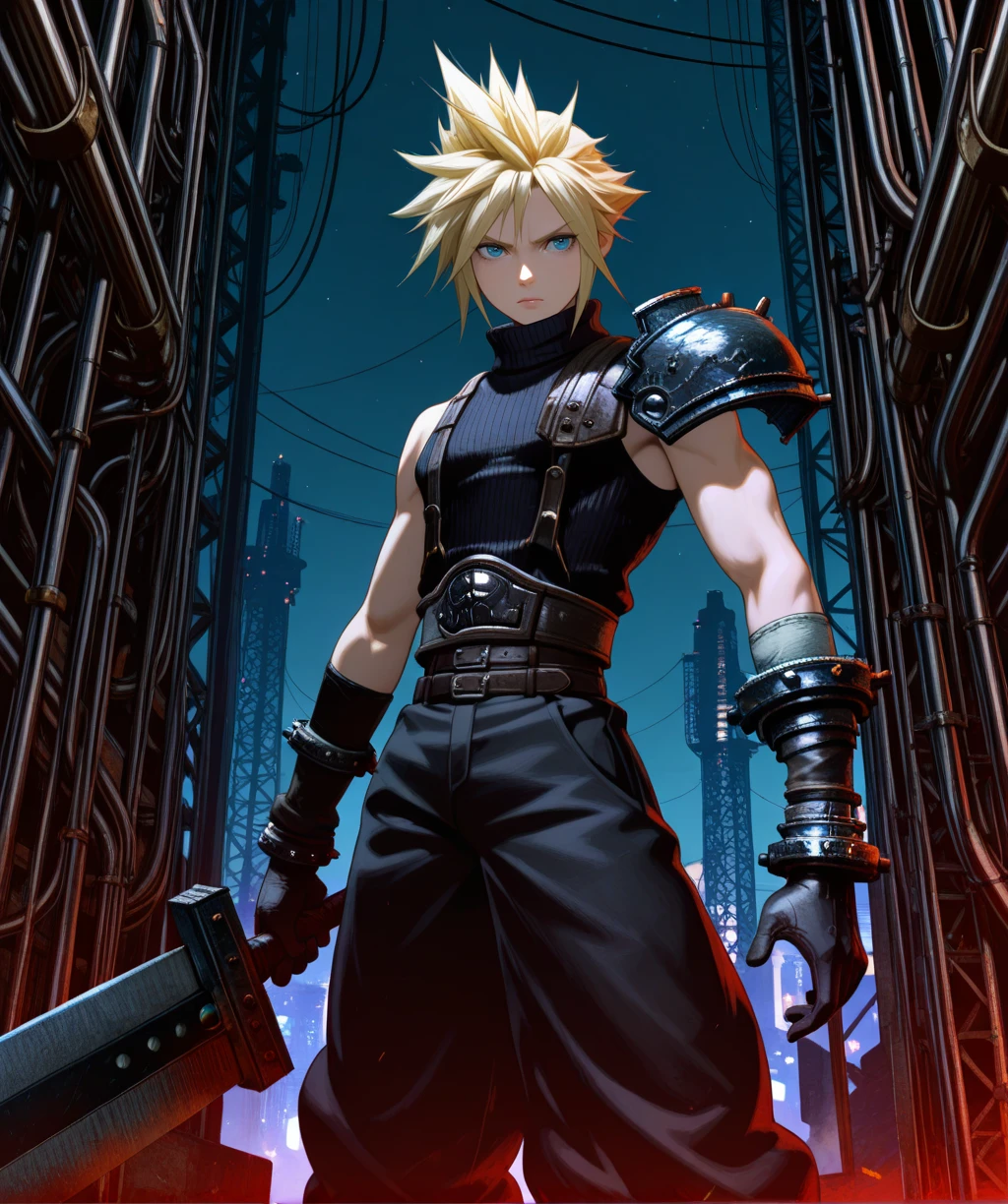 gloves, or asymmetrical gloves, sleeveless turtleneck,shoulder armor, baggy pants, belt, boots,