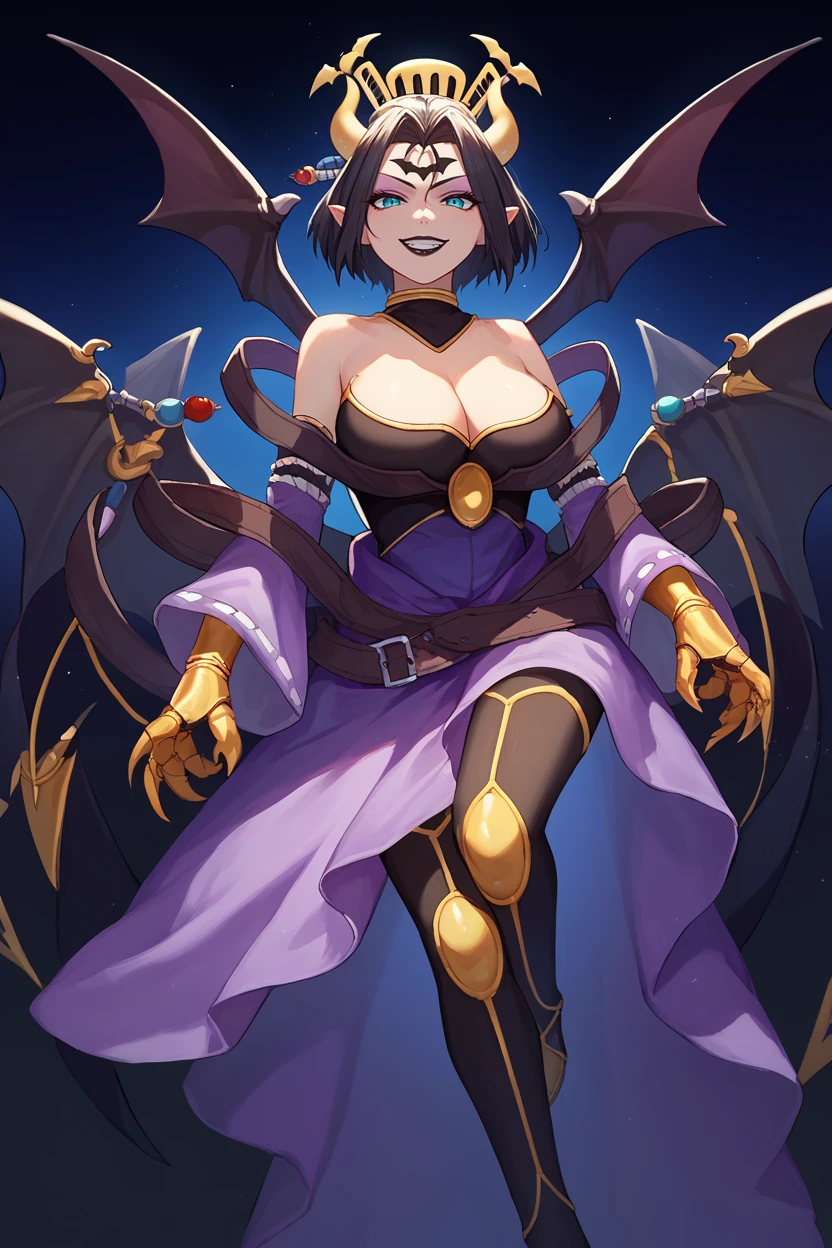 horns, demon wings, hair ornament, gauntlets, ???? shoulders, cleavage, dress, purple dress, detached sleeves, black thighhighs, black lipstick