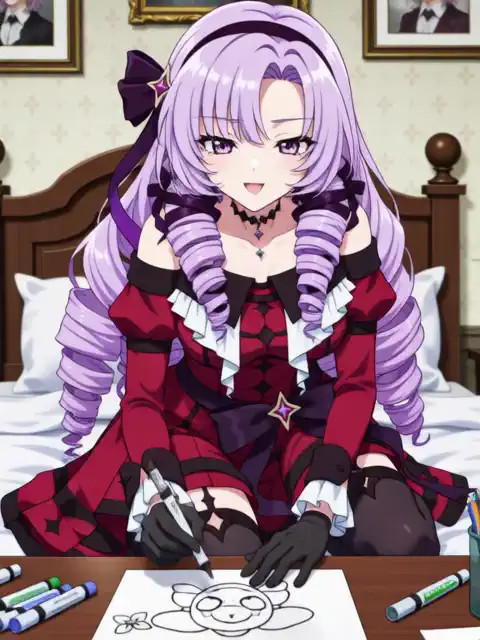 sample prompt:Hyakumantenbara Salome, anime-style girl. The image features an anime-style character with long, flowing purple hair that cascades down past her shoulders. Her hair is styled in loose waves, giving it a soft and elegant appearance. She has large, expressive purple eyes. She is dressed in a detailed and elaborate outfit that combines elements of Victorian and gothic styles. The top part of her dress is a deep red with black accents, featuring ruffled sleeves and a high collar. The skirt is voluminous and layered, with a combination of red and black colors, and it has a large bow at the waist. The character is also wearing thigh-high boots that match the red and black theme of her outfit. She has black gloves. (she is dancing:4.0), (chibi Nendoroid:4.5) in bedroom.