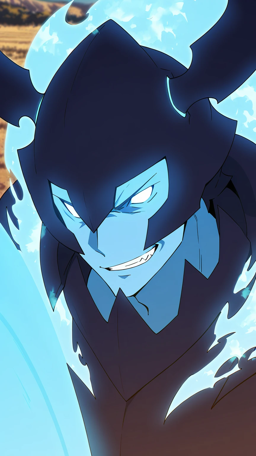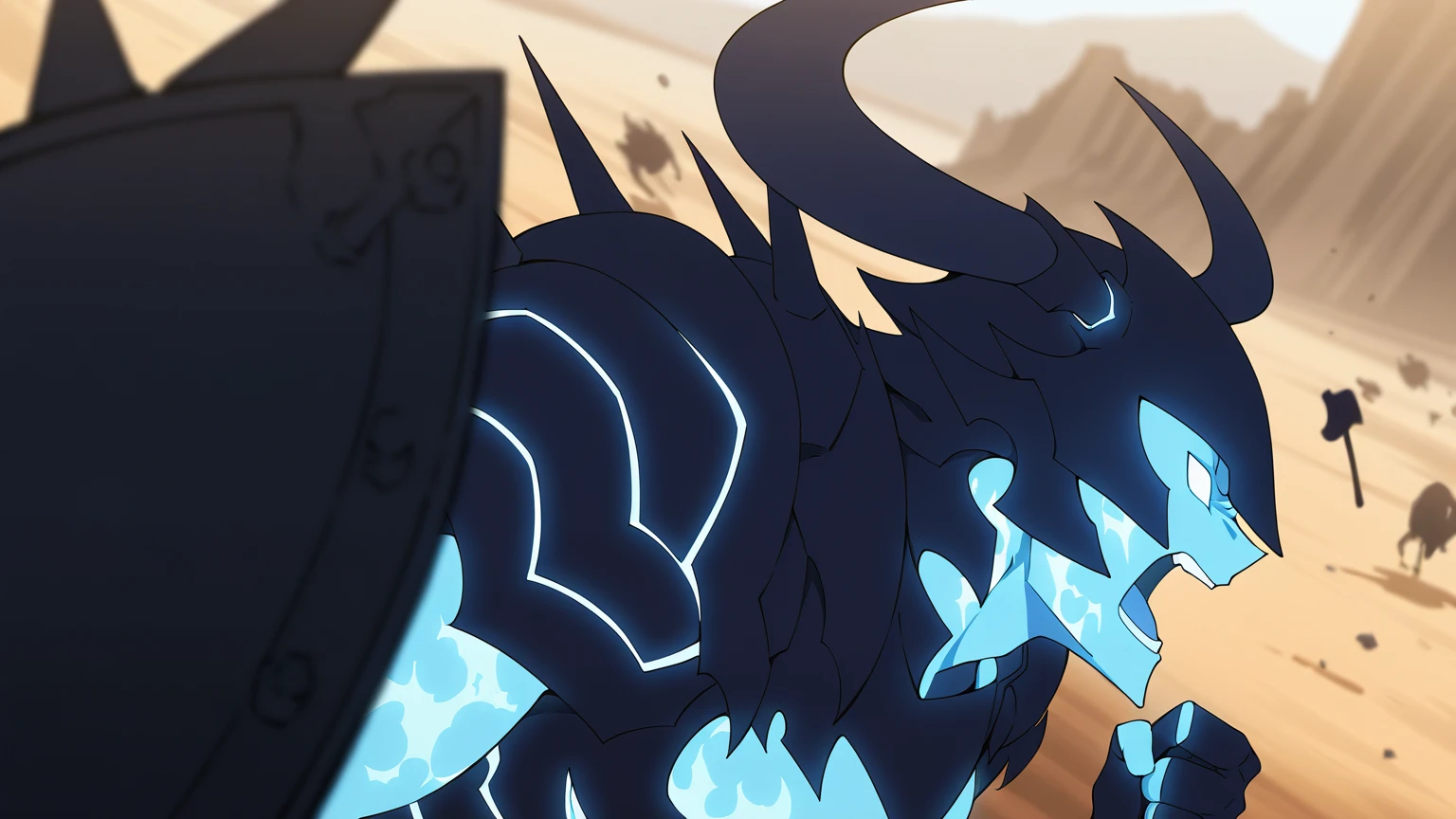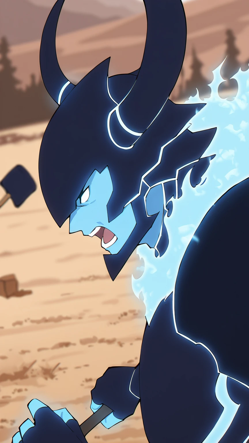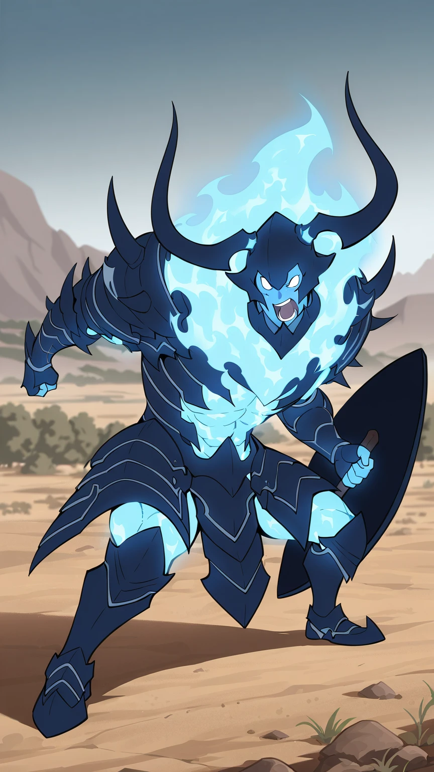 IronV2, Armour, Horns, Blue Flamming Skin, Dark Blue Armour, Blue Flames, large axe, large Shield, Spikes, fingerless gloves, Flamming Skin, Muscular, Blank Eyes