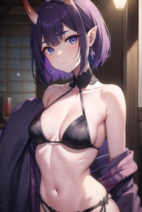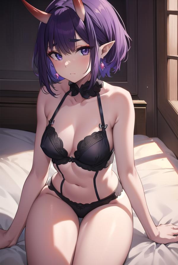 shuten douji, (purple eyes:1.2), earrings, eyeshadow, horns, makeup, oni horns, purple hair, red eyeshadow, short eyebrows, short hair, single earring, (small breast:1.2), pointy ears,