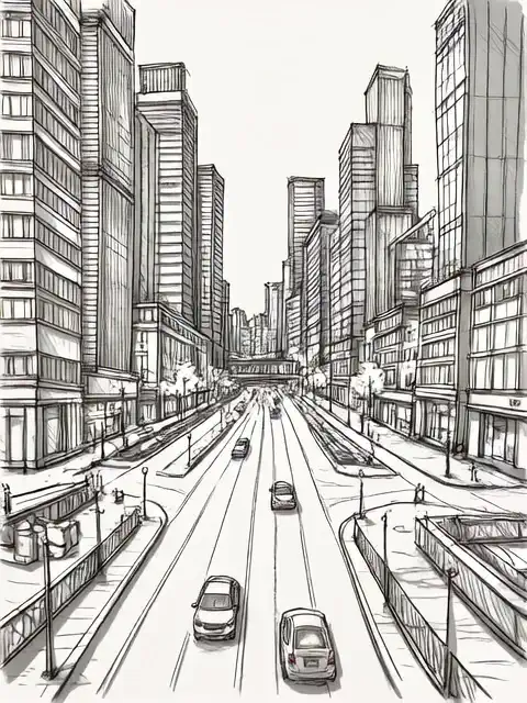 In a bustling city, towering skyscrapers reach towards the sky, their glass and steel facades reflecting the soft glow of streetlights. Cars navigate the busy streets below, their headlights and taillights creating streaks of light in the night. The entire scene is rendered in a sketchy, hand-drawn style with bold, expressive lines that capture the energy and movement of the urban landscape.