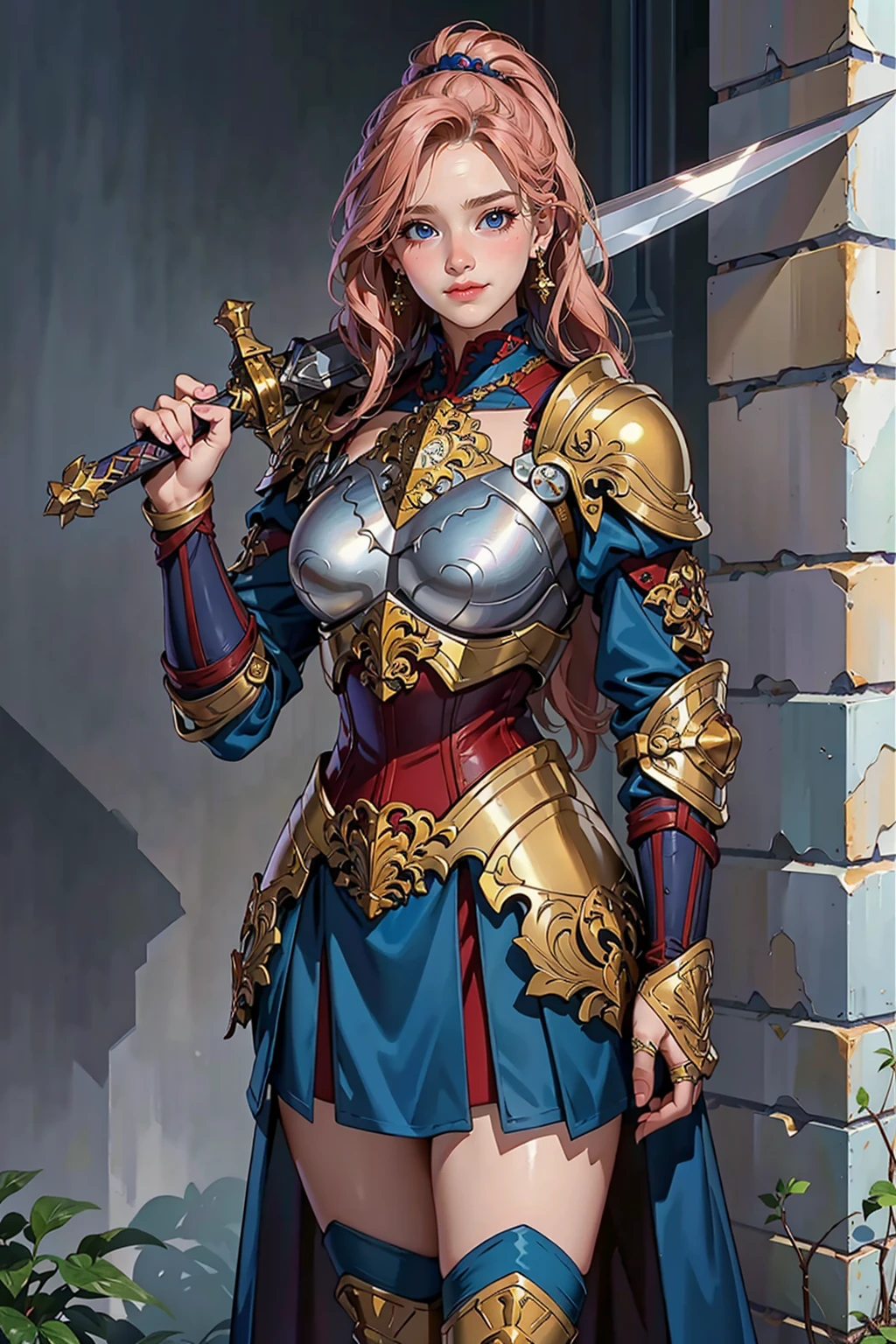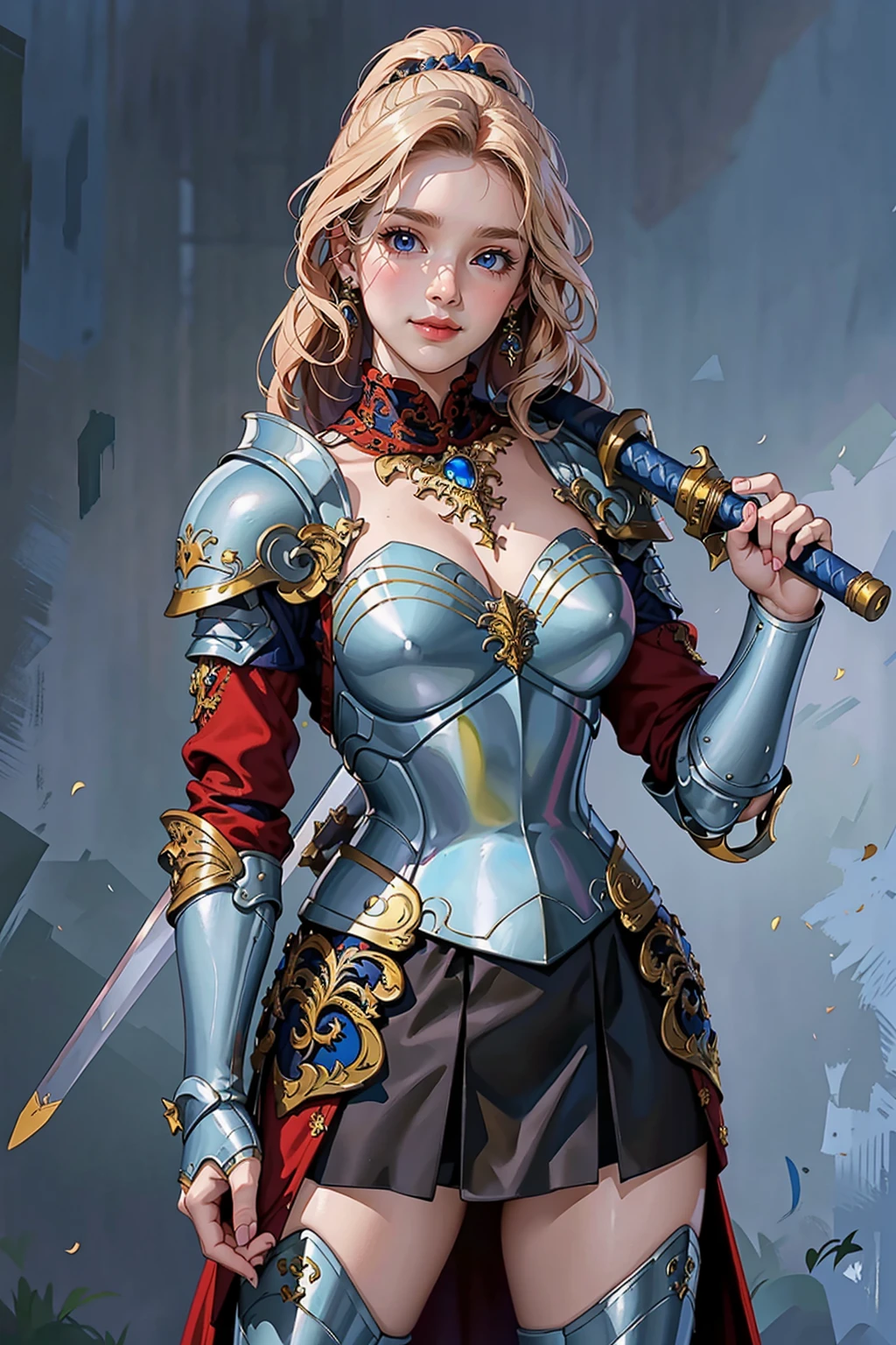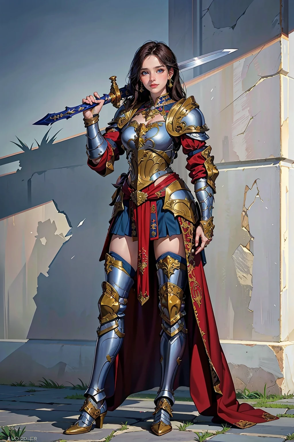 Major keyword : ((holding sword)), armor, greaves, armored boots, pauldrons, breastplate, gauntlets, knight, belt, cape, fur trim, standing, solo ,1girl