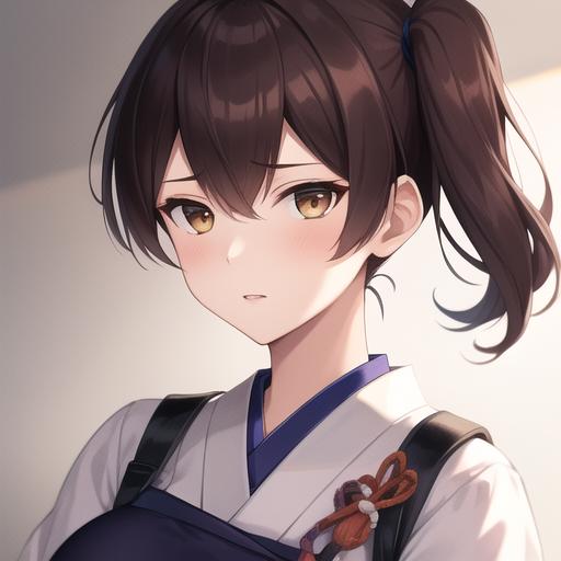 (masterpiece, best quality:1.2),illustration,8k,hd,1girl,solo,upper body,(portrait:1.2),brown_hair,side_ponytail,brown_eyes,short_hair,long_hair,large_breasts,japanese_clothes,muneate,skirt,partially_fingerless_gloves,yugake,black_thighhighs,tasuki,hakama_short_skirt,single_glove,<lora:Kaga>,