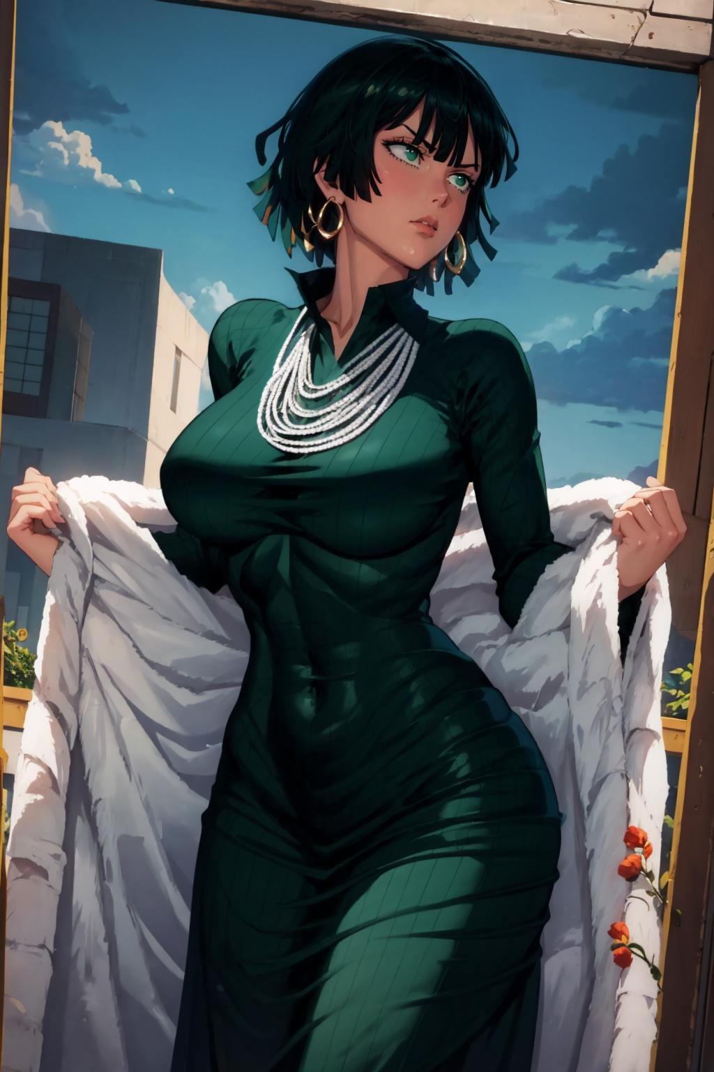 Outfit: green dress, detached collar, taut clothes, taut dress,fur coat, jacket on shoulders