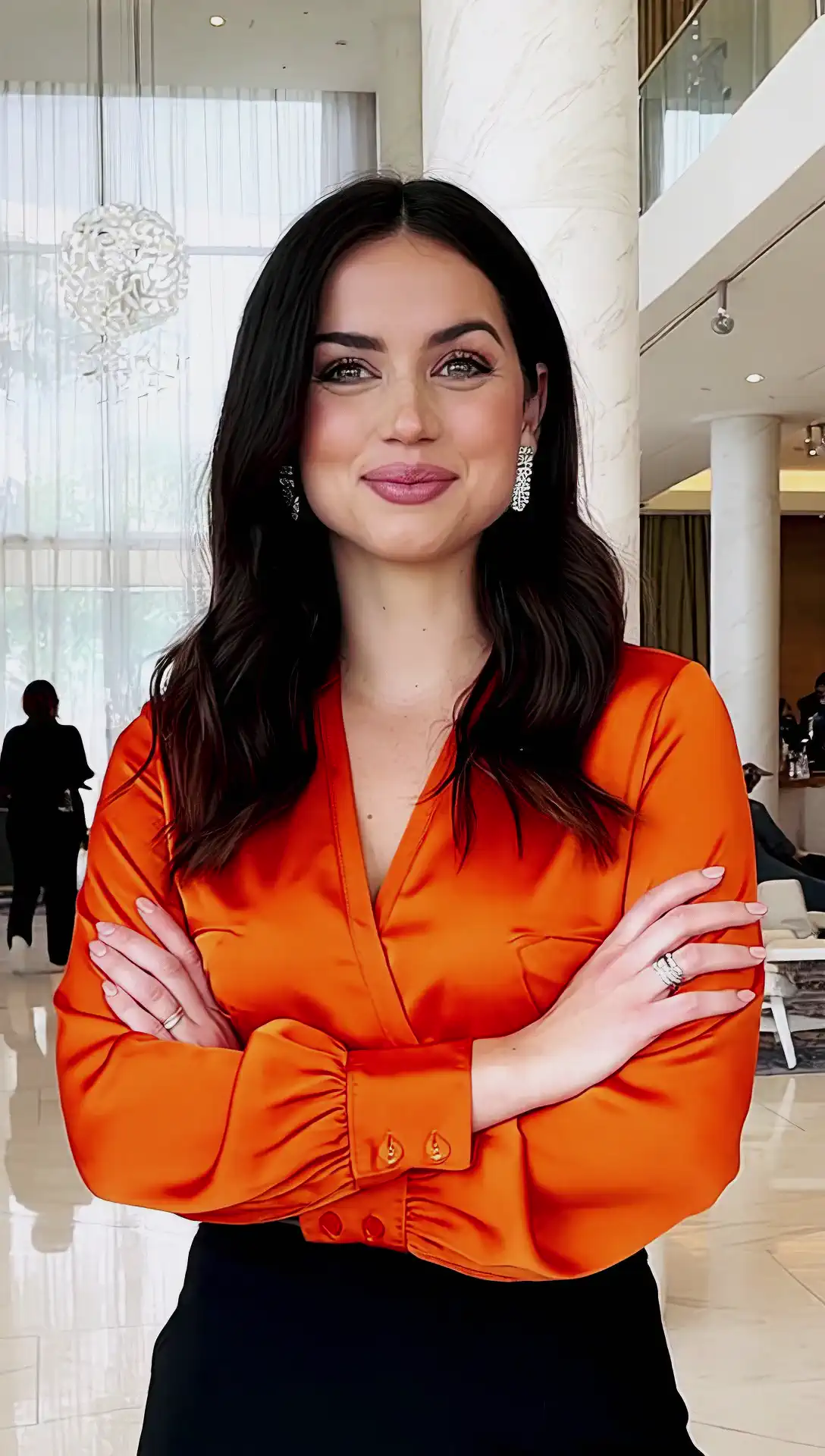 Example prompt (ComfyUI): A woman, wearing a shirt with a white blazer, with diamond earrings, looks directly at the viewer. Her hair swaying gently, her subtle smile widening slightly as she blinks, her eyes sparkling with a slight movement.