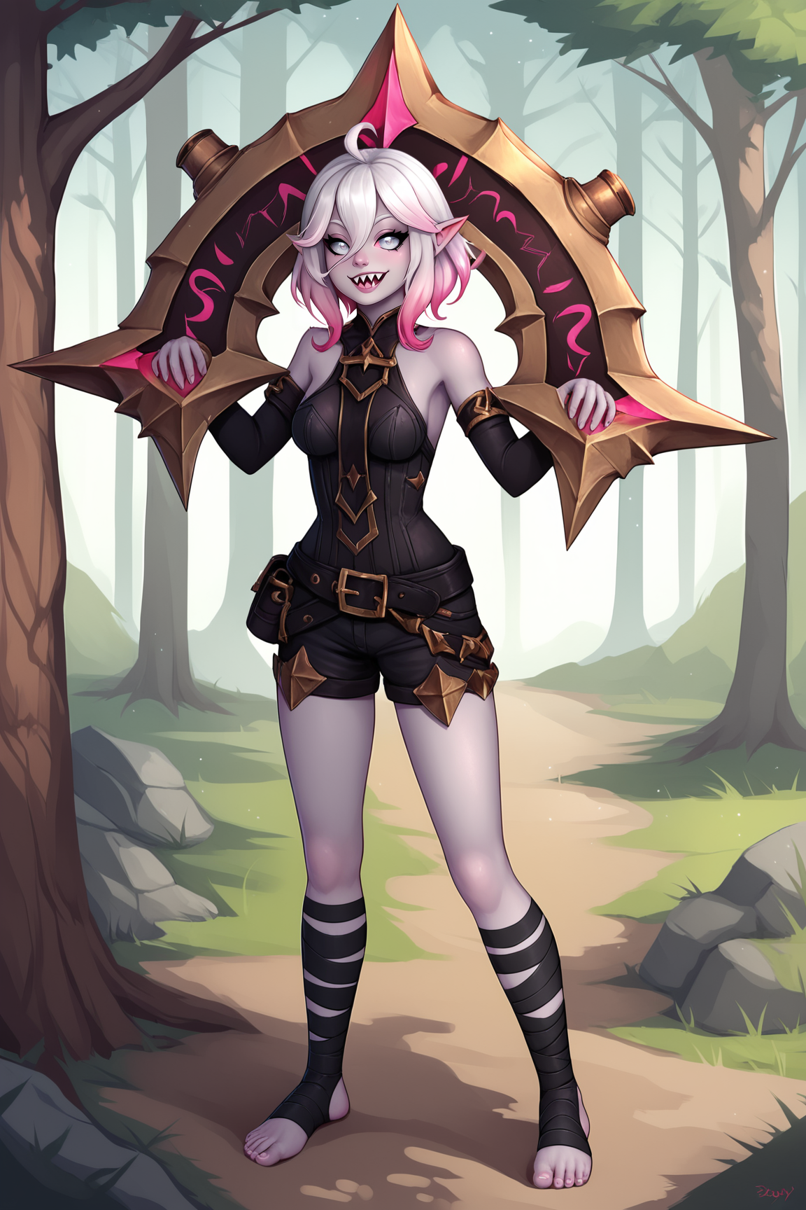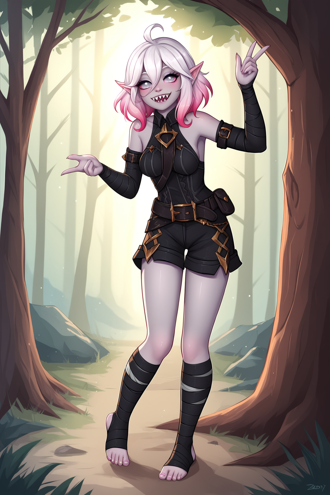 BriarLoLXLv2, grey skin, colored skin, no pupils, grey eyes, pink sclera, white hair, pink hair, two-tone hair, gradient hair, short hair, hair between eyes, ahoge, pointy ears, sharp teeth, medium breasts, bare shoulders, black thight dress, detached sleeves, black bandaged sleeves, black shorts, belt, (black bandaged legwear), toeless legwear