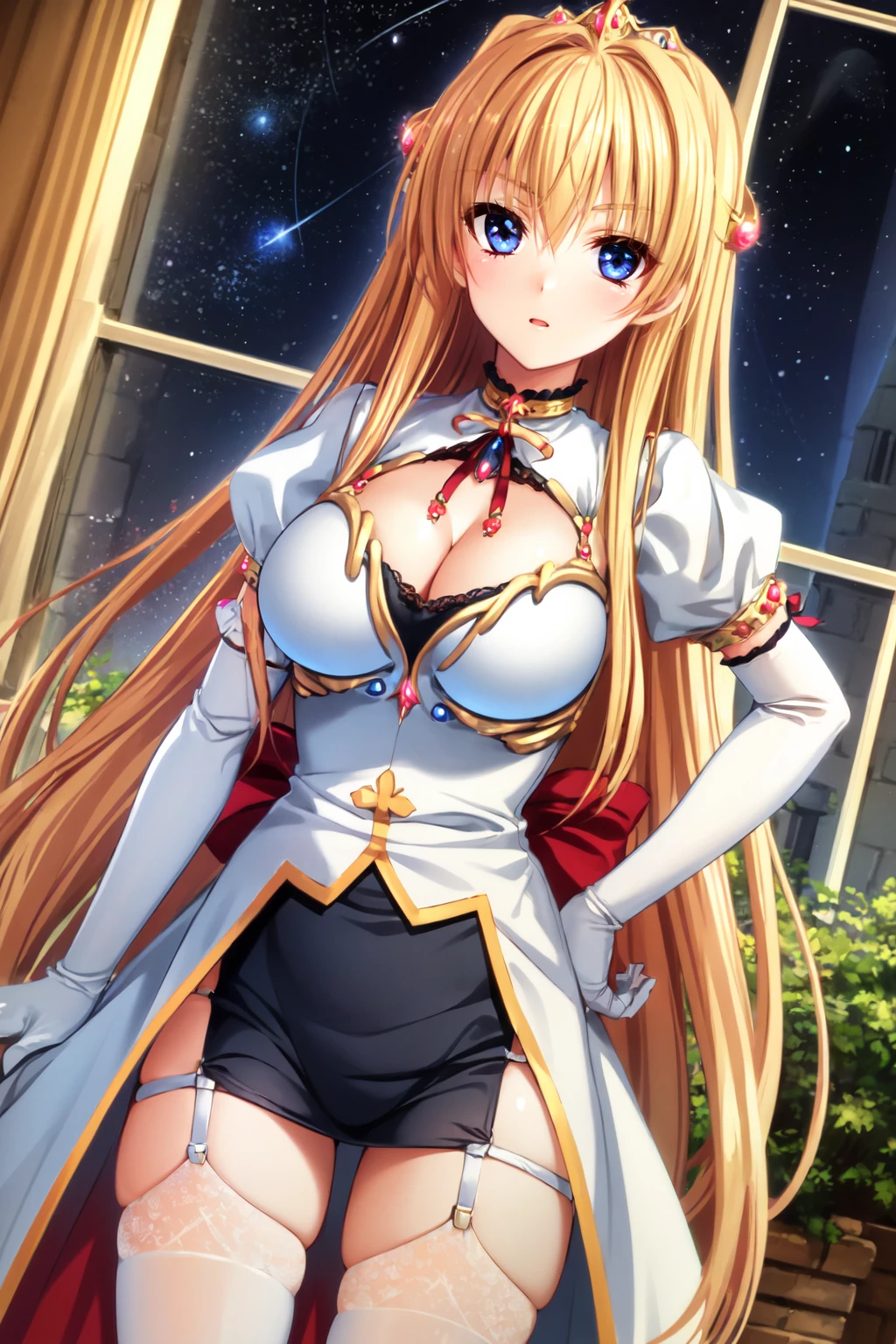 tiara, hair ornament, dress, cleavage cutout, short sleeves, elbow gloves, garter straps, thighhighs, knee boots, cross-laced footwear