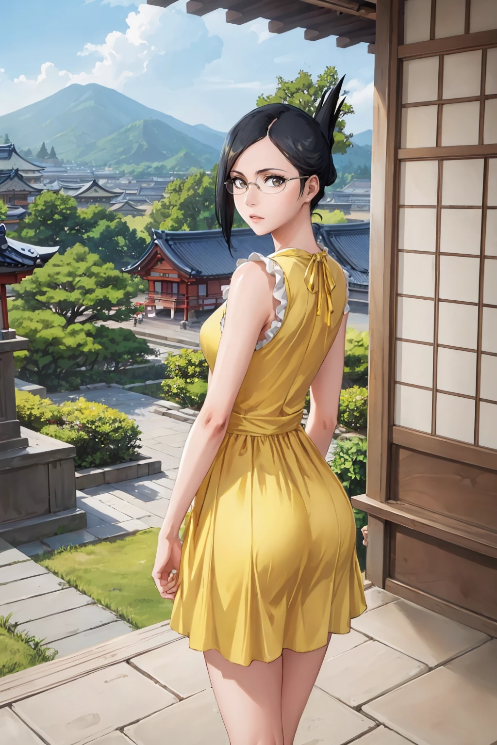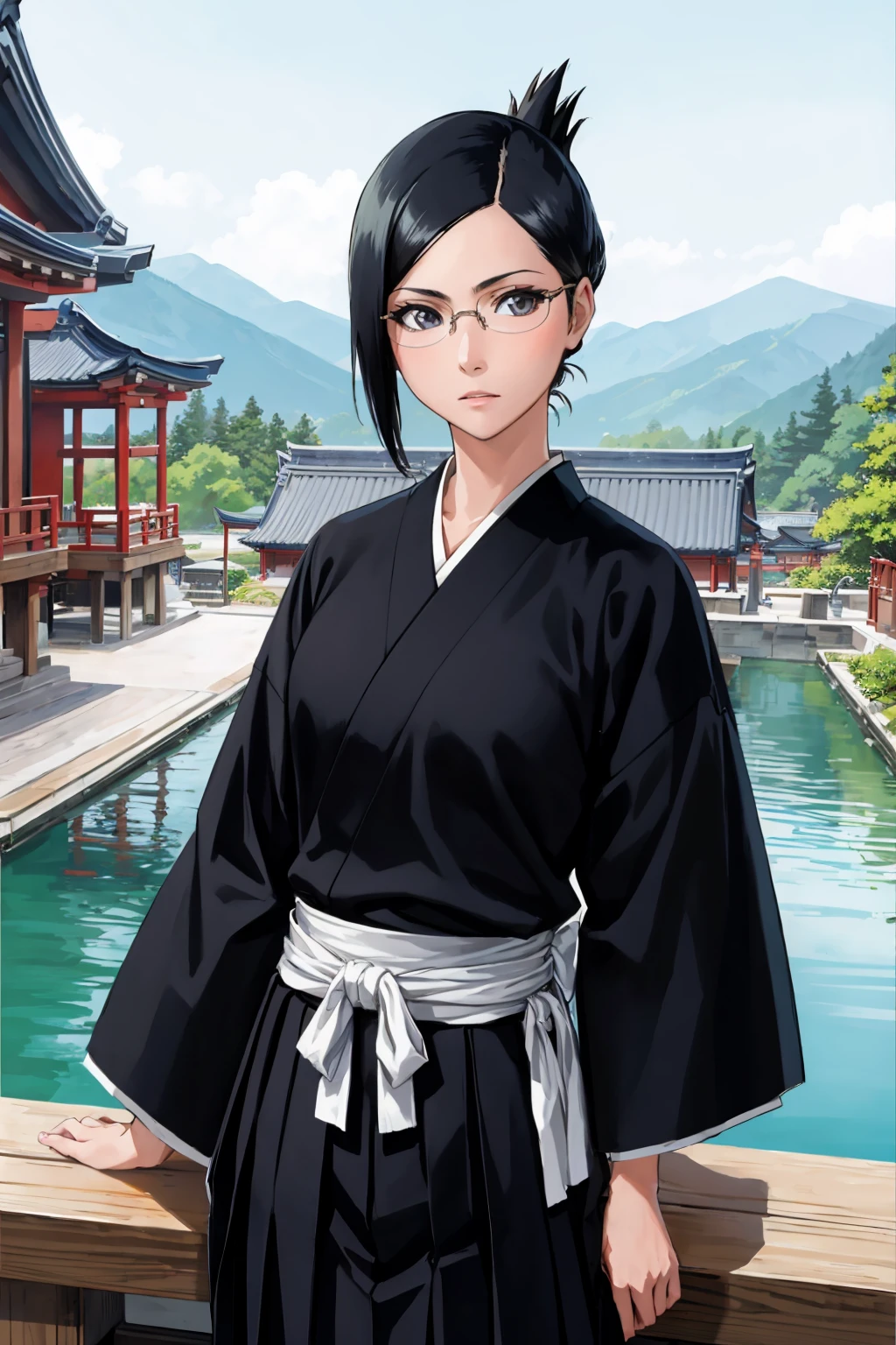 Add "glasses, black robes, sash, hakama skirt" for her typical look.