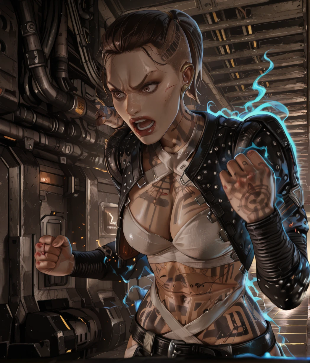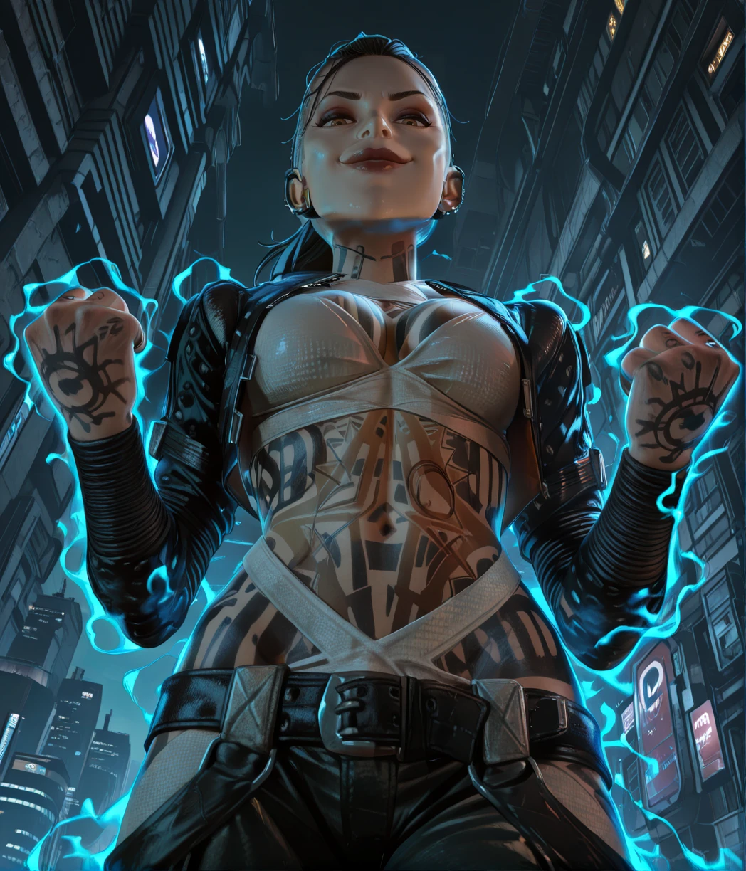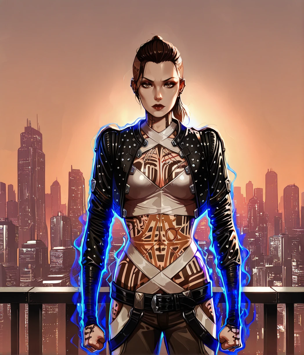 open leather jacket, white wrappings, or white leotard, or white bandages,