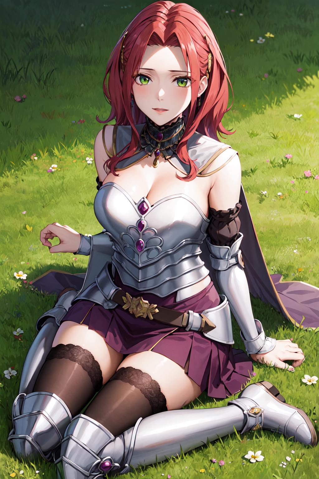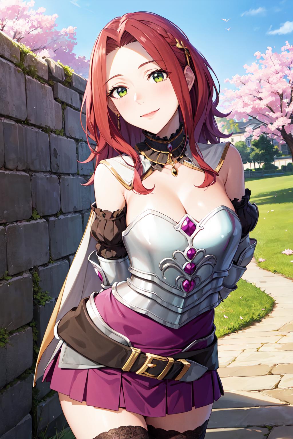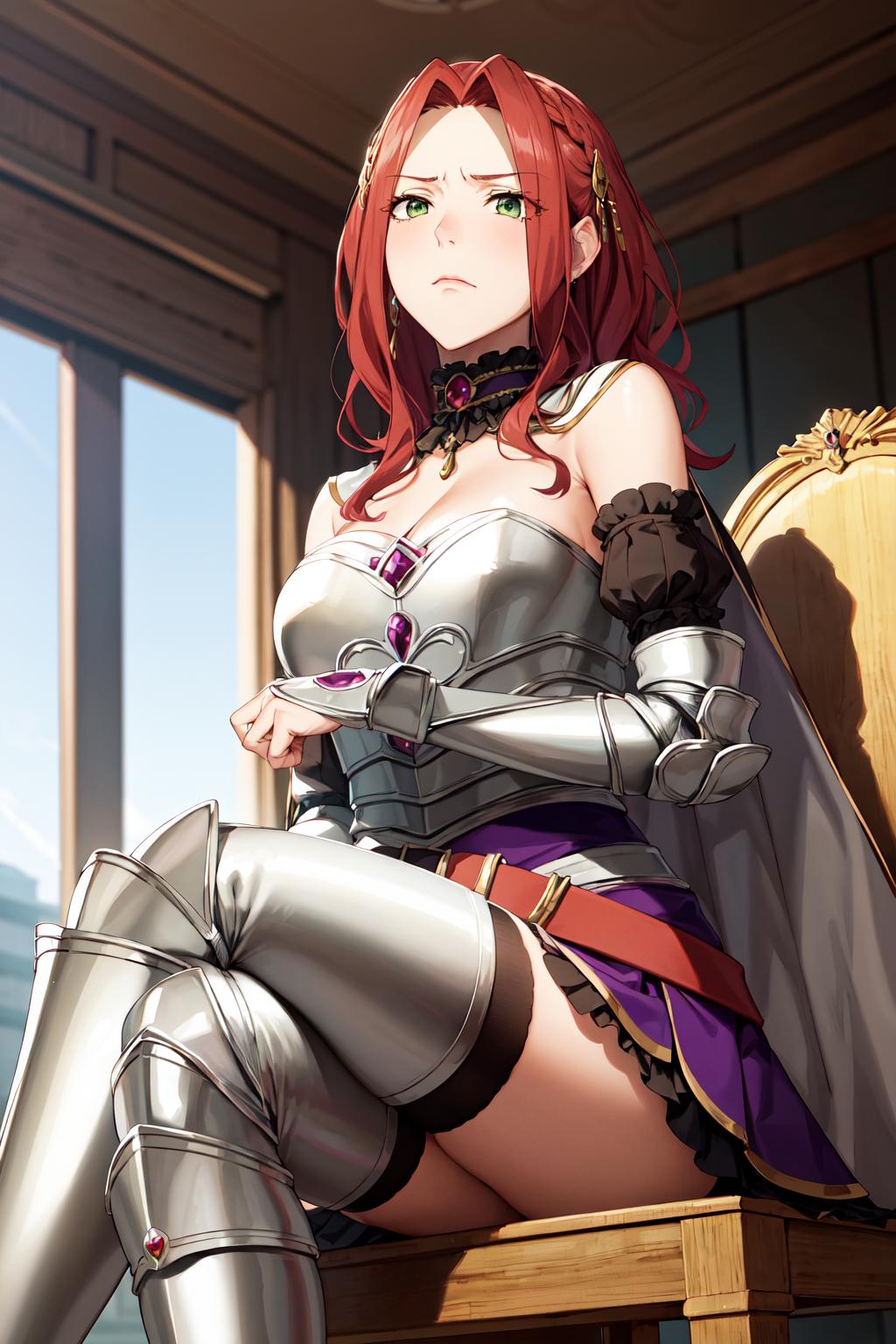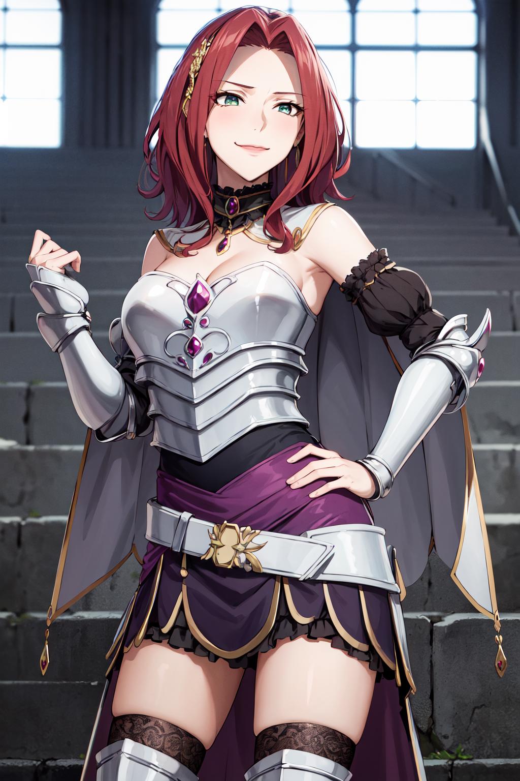 aamyne, solo, long hair, choker, cape, armor, cleavage, breastplate, armored dress, detached sleeves, belt, purple skirt, thighhighs