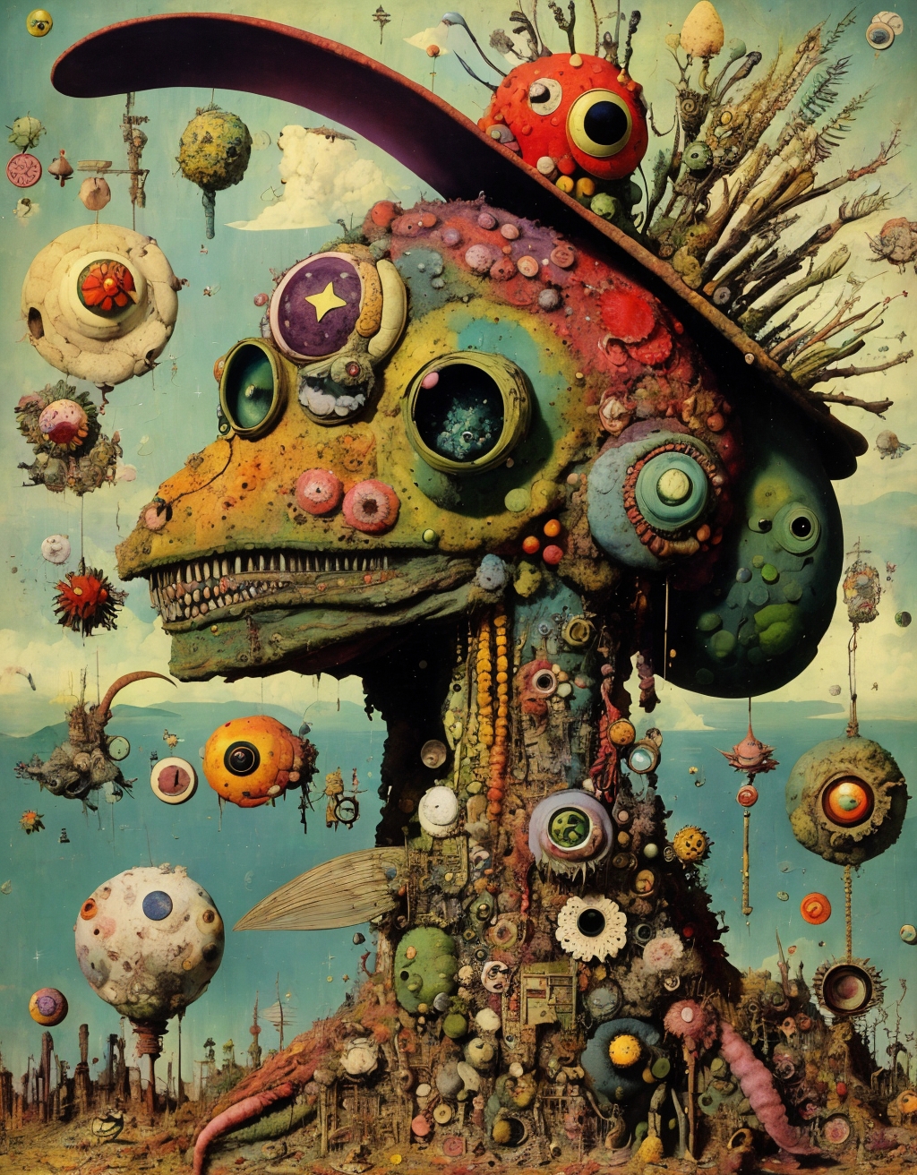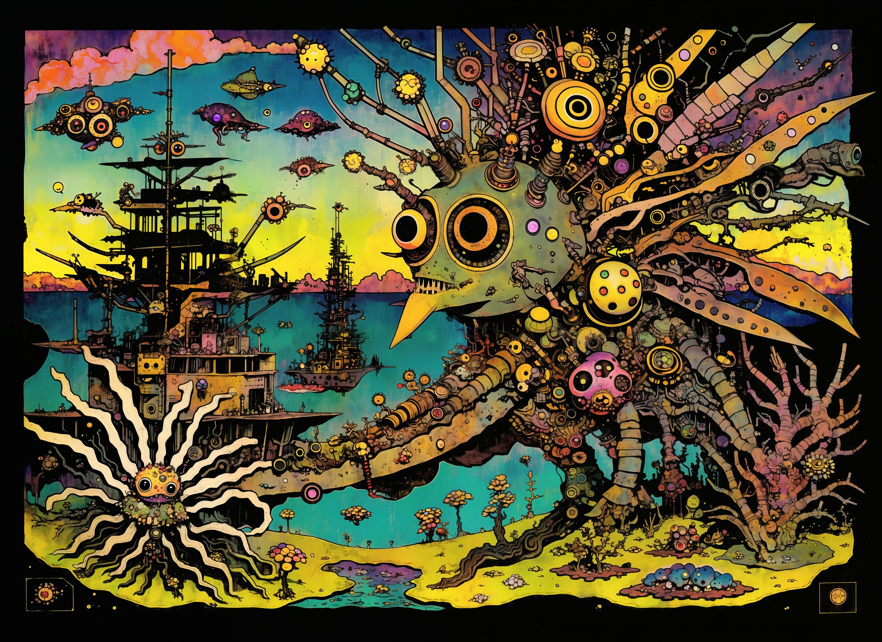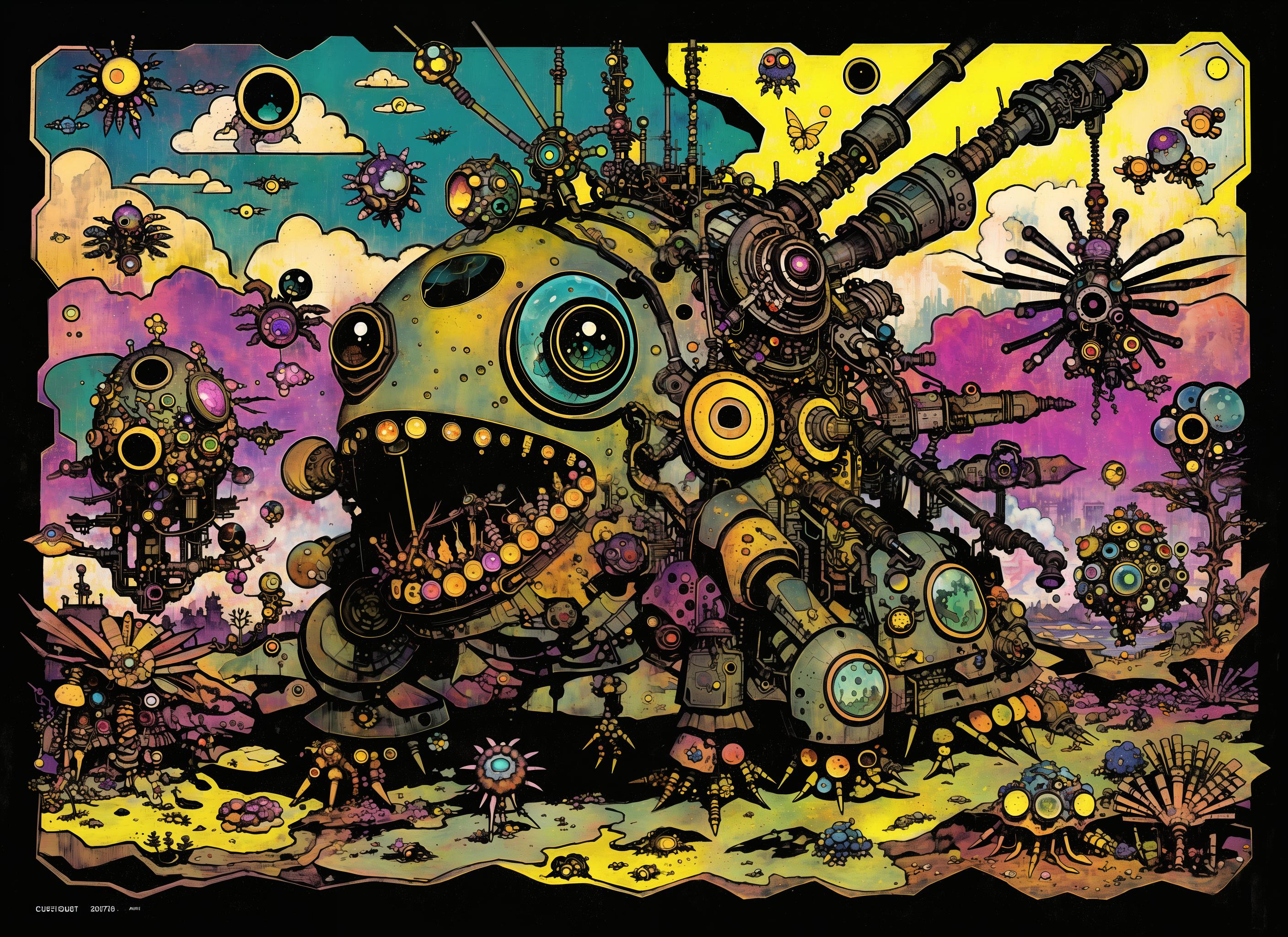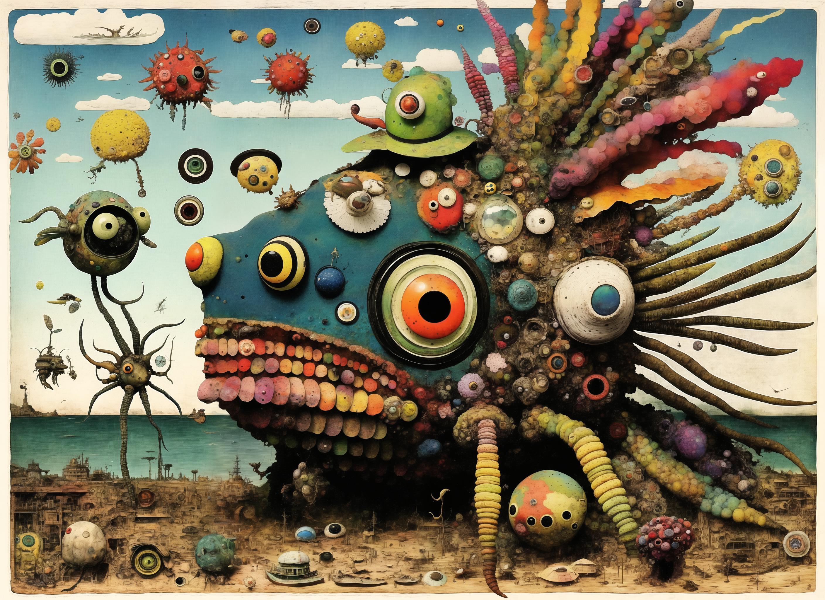 Further words to use based on captioning in the training are: insect, monster, gears, paper, creature, weird, robot, eye, giant, scrap, frog, fish, bird.