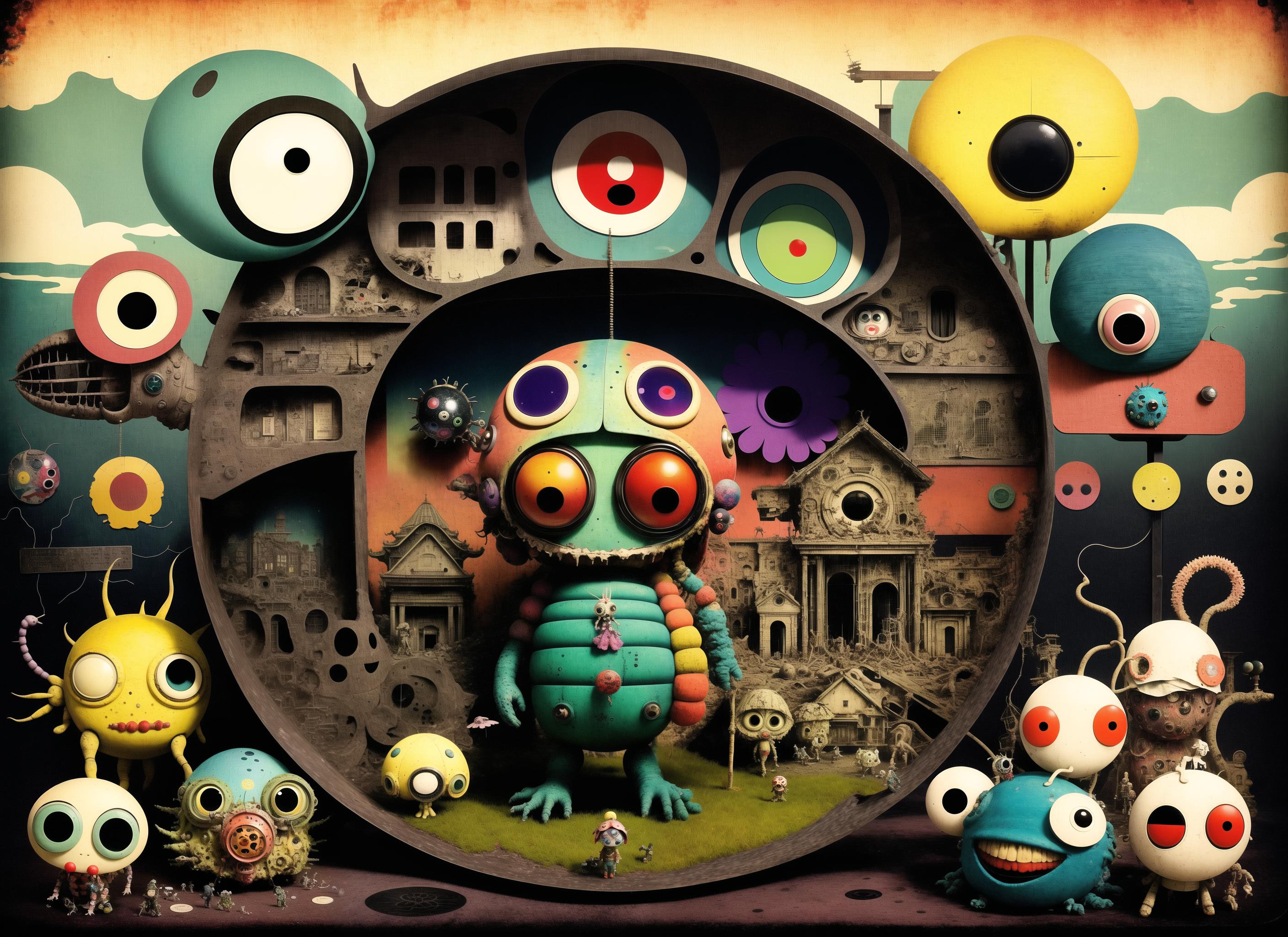 A gonzo and bizarro style based on collage, assemblage and mixed media involving insects and insect like monsters and other animals as subjects.