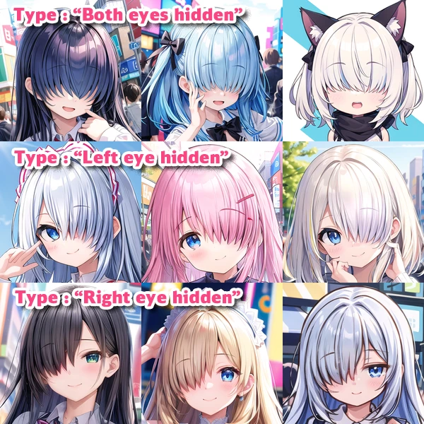 前髪で目が完全に隠れているキャラクターを、標準プロンプトだけよりも強力に再現できます。