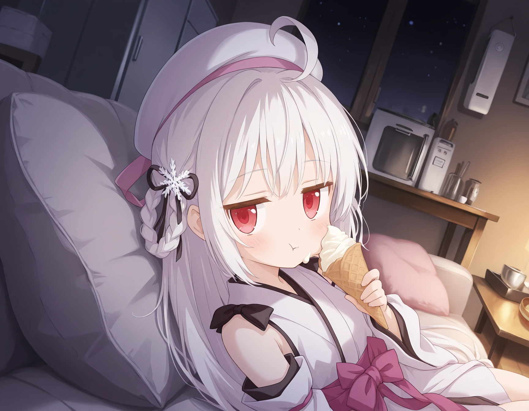 YuukiAST,white hair,very long hair,red eyes,ahoge,braided hair rings,beret,hair ribbon,beret ribbon,snowflake hair ornament,pom pom hair ornament,japanese clothes,white kimono,layered kimono,detached sleeves,long sleeves,wide sleeves,layered sleeves,arm ribbon, shoulders,shoulder bow,pink sash,waist bow,white dress,layered dress,black inner dress,front slit,white tabi,okobo,pom pom ankle ribbon,
