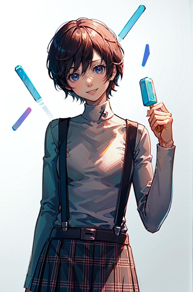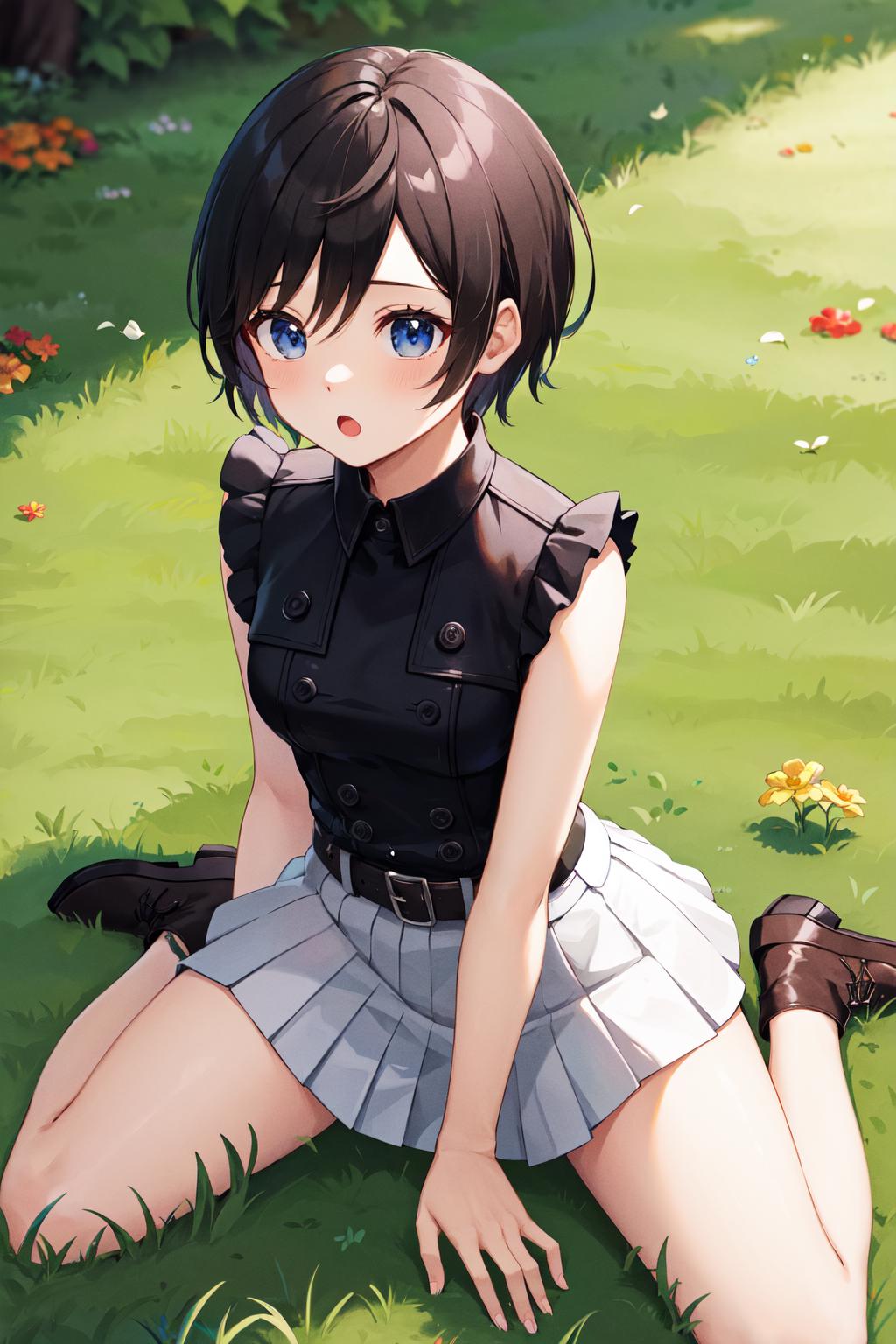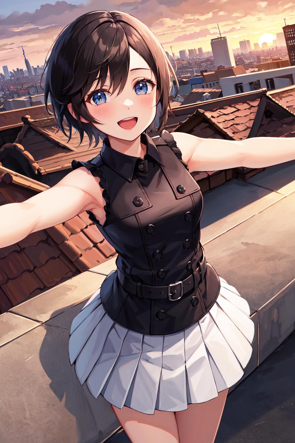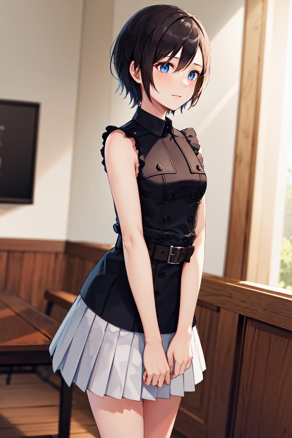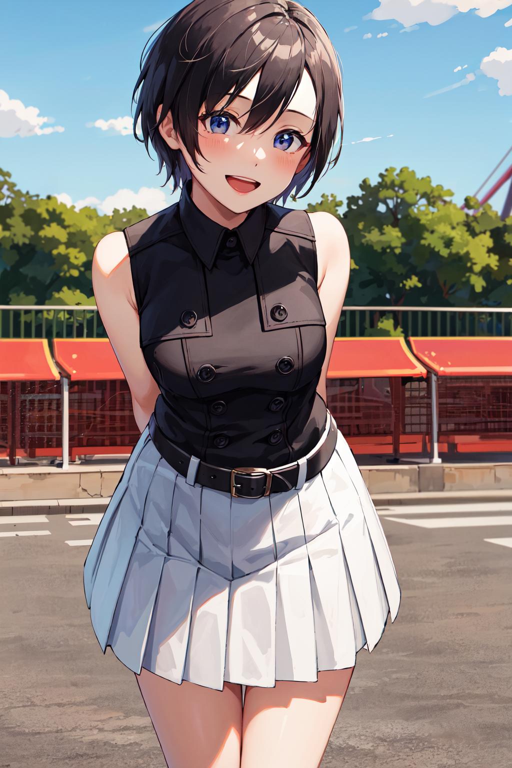 aaxion, short hair, black shirt, sleeveless shirt, buttons, black belt, white skirt, pleated skirt