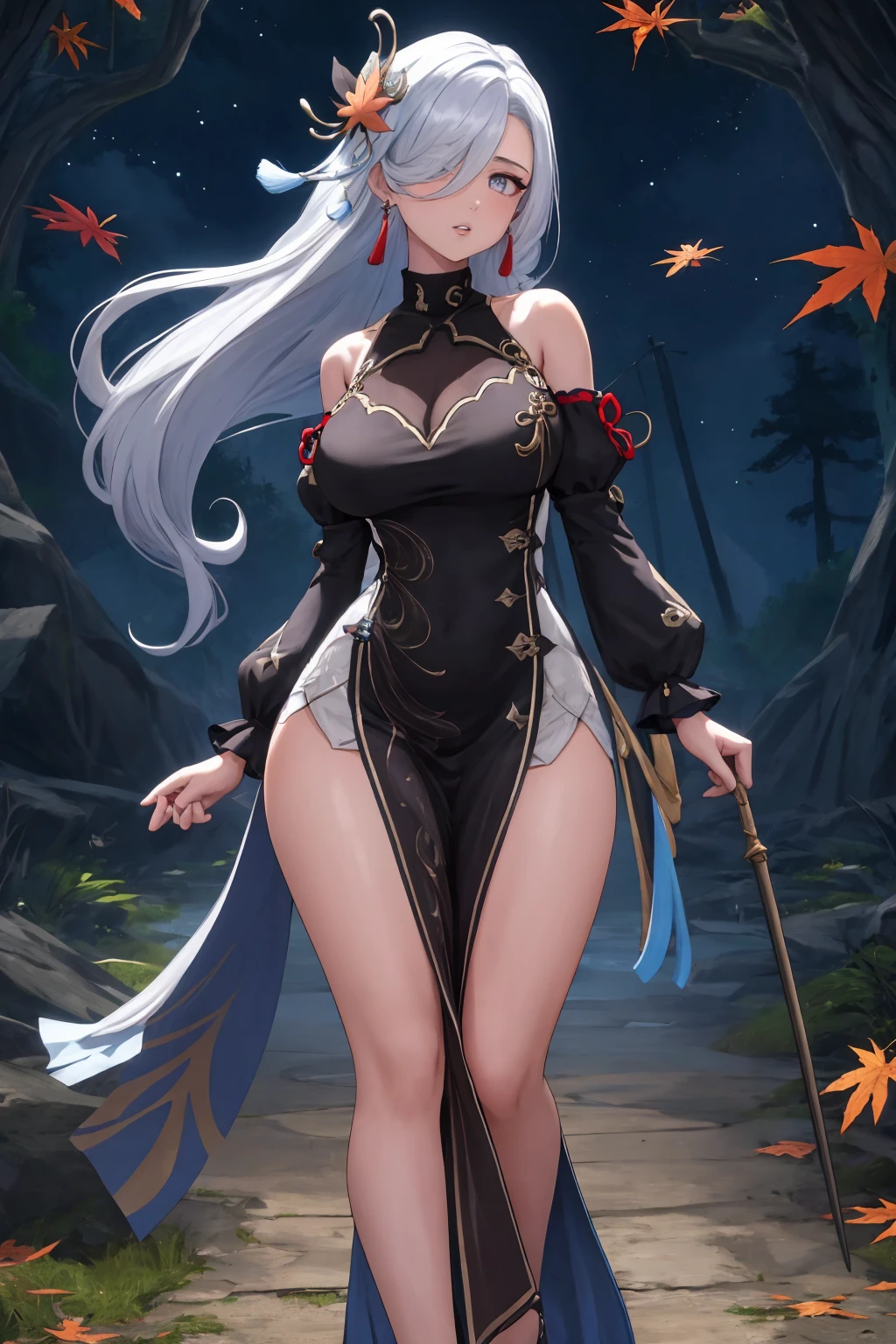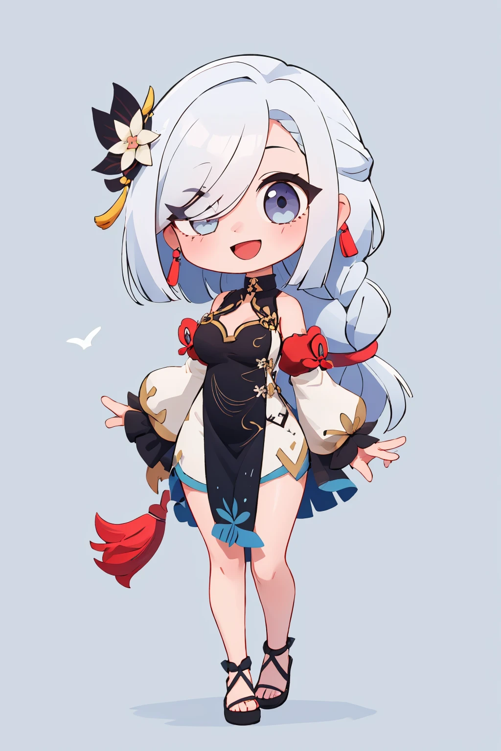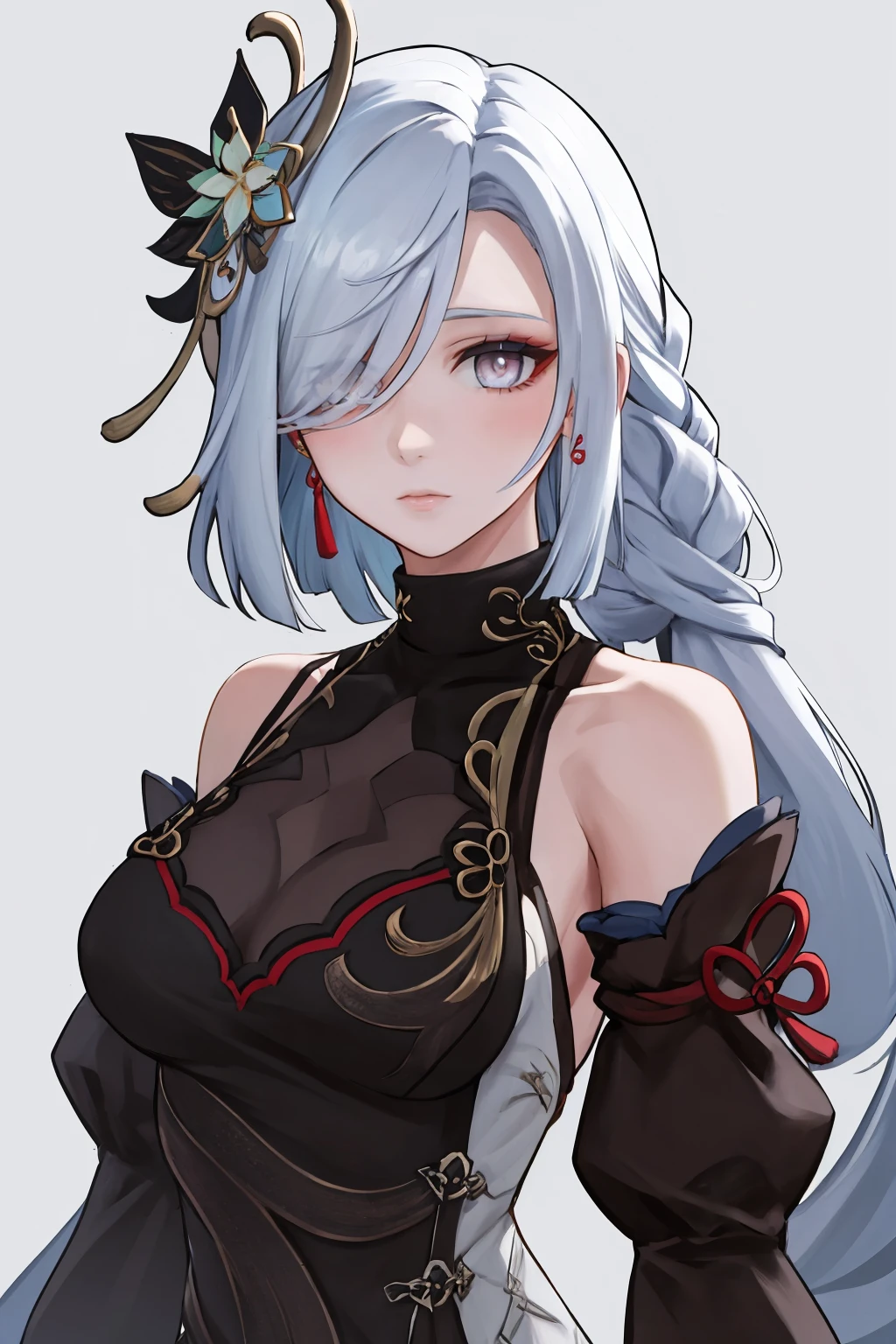 shenhefd, braid, hair ornament, hair over one eye, earrings, dress, detached sleeves, tassel