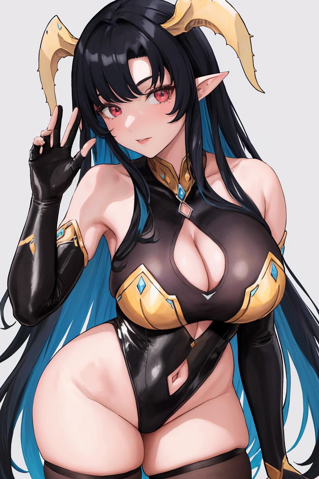 cialadef, horns, pointy ears, leotard, cleavage cutout, elbow gloves